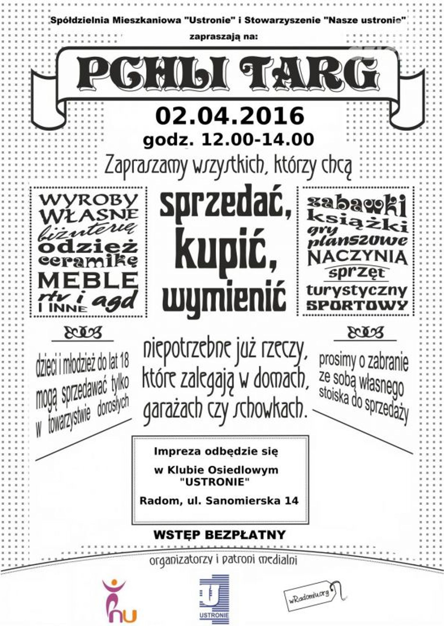 organizatorzy czekają na wszystkich , którzy chcą sprzedać, kupić lub wymienić niepotrzebne już rzeczy np. odzież, zabawki, rtv, ceramikę, wyroby własne, książki, gry planszowe, meble, naczynia i inne rzeczy, które zalegają w domach, garażach czy schowkach. Duże rzeczy można "przynieść" na zdjęciu. Spotkanie będzie miało również na celu integrację lokalnej społeczności.