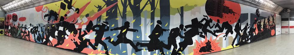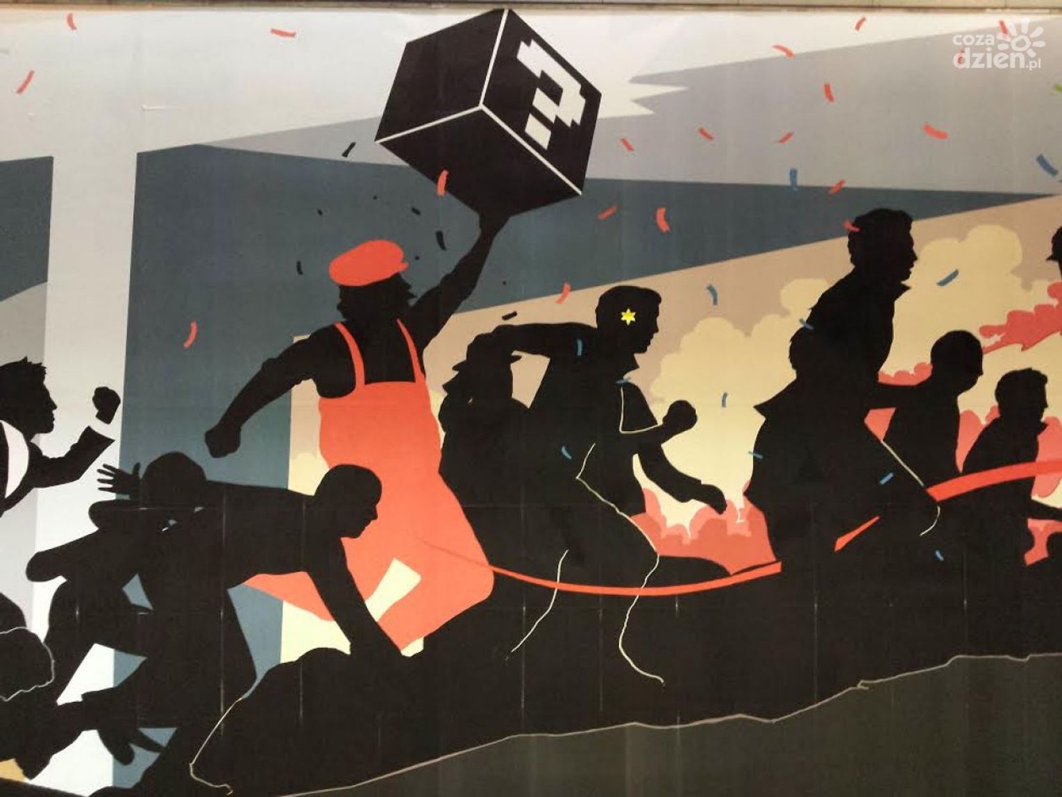 To nie jest mural.Tyle, że jest eksponowany na murze. Ale z formy przypomina raczej wycinankę. Gigantyczną. Z postaciami naturalnej wielkości.
