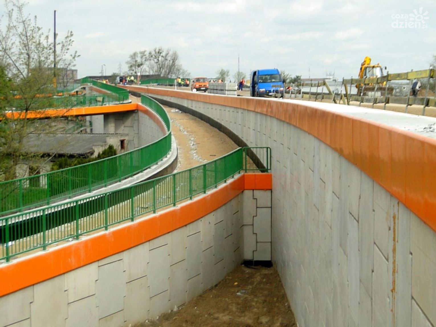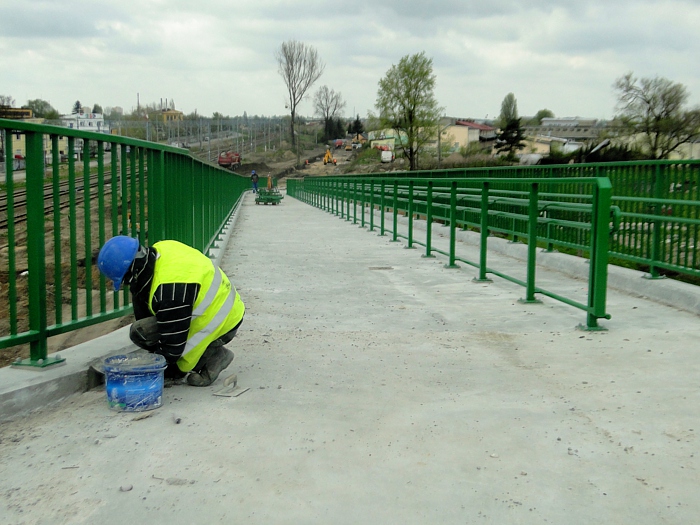 Trwa piaskowanie ciągów pieszych na obiekcie przy użyciu myjek wysokociśnieniowych. Pozwalają one na szybkie i dokładne czyszczenie betonowych nawierzchni. Inne ekipy montują ostatnie barierki na schodach prowadzących na wiadukt. Po obu stronach przeprawy zamontowane są prawie wszystkie gzymsy. Na dojeździe do obiektu od strony południowej trwa ustawianie krawężników.