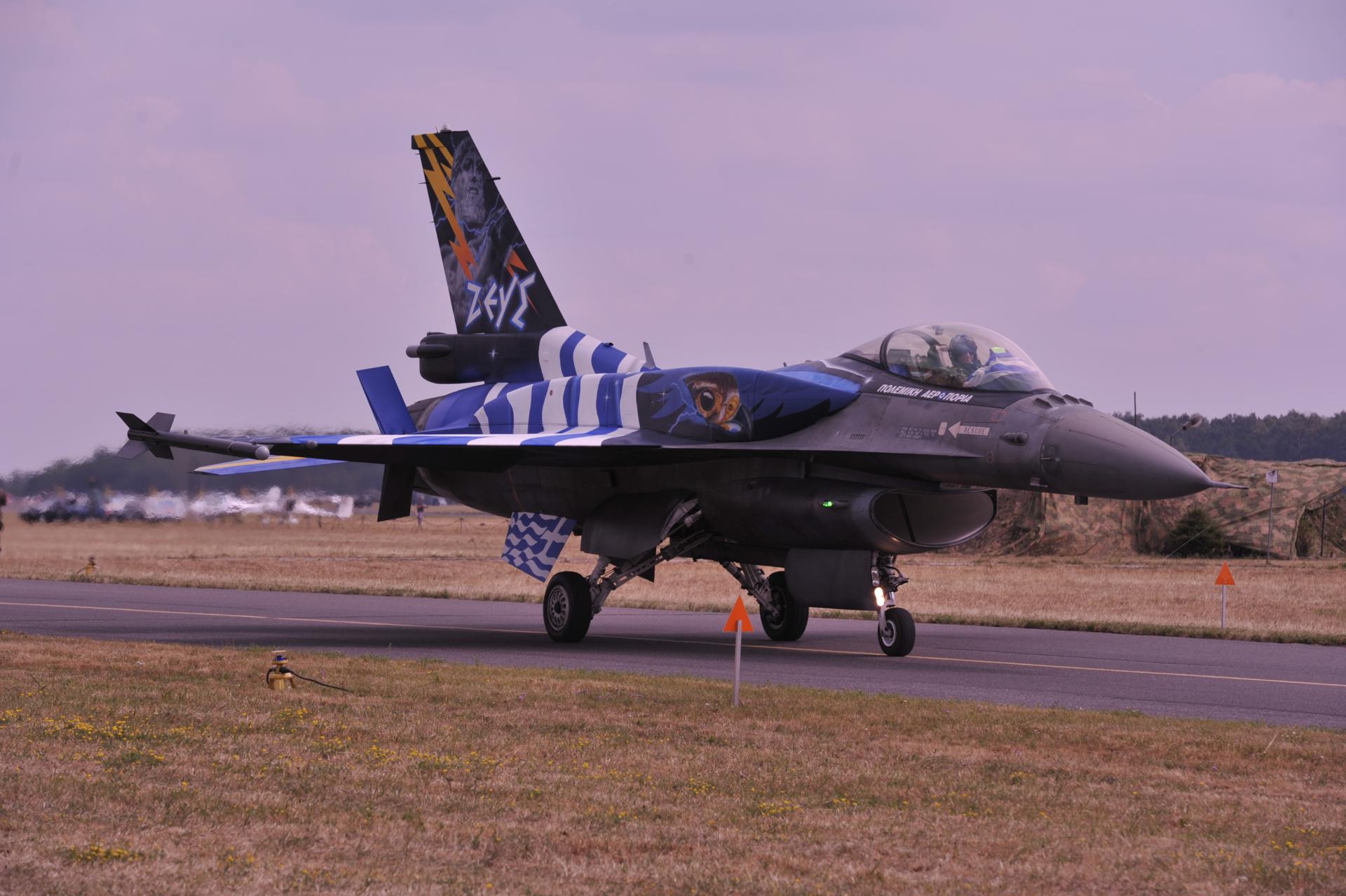 Szwajcarzy już na ziemi, a teraz swój układ prezentuje solista z Gracji. Przybysz z Hellady lata na maszynie F-16 ZEUS.