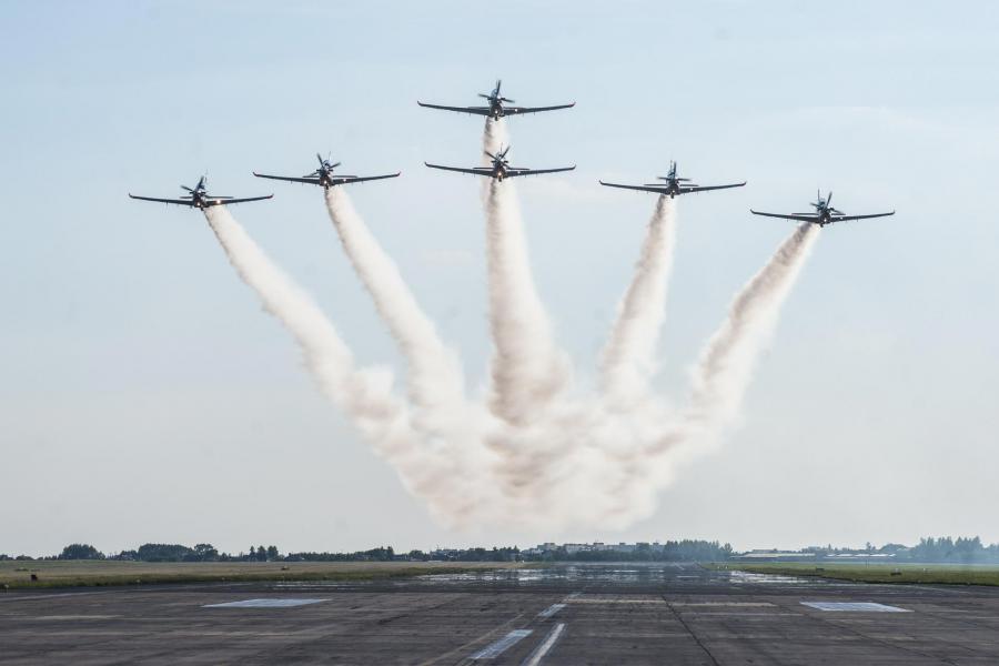 Hiszpanie już na ziemi, a w przestworza wzbija się austriacki solista, który korzysta z samolotu Pilatus PC-7. To lekka szkoleniowo-treningowa maszyna, która cieszy się popularnością na całym świecie.