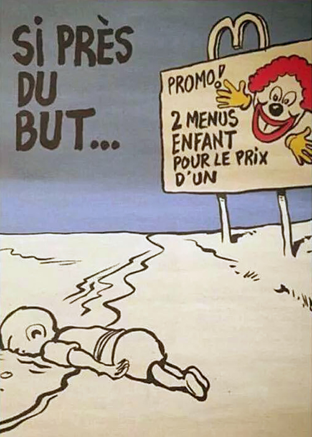 „Tak blisko do celu. Promocja! Dwa zestawy dziecięce w cenie jednego.” Zamieścili rysunek, który wzorowany jest na zdjęciu, które obiegło świat. Ciało 3-letniego Aylana Kurdiego, który utonął w próbie przepłynięcia przez granice, a jego ciało woda wyrzuciła na brzeg. Do dzisiaj symbol tragedii i wojny, jaka dotknęła wschód.