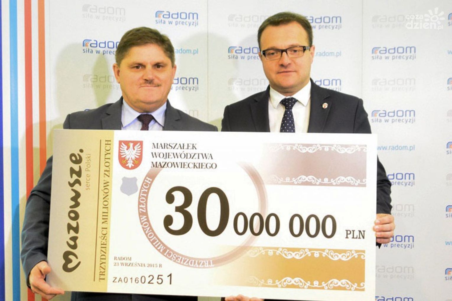 W piątek, 25 września podczas konferencji symboliczny banknot o wartości 30 mln złotych na ręce prezydenta Radosława Witkowskiego złożył Leszek Ruszczyk, wicemarszałek województwa mazowieckiego. - To jest symbol, ale aneks, który podpiszemy skieruje do Radomia 30 mln w ramach dofinansowania do obwodnicy południowej i jest to zwiększenie udziału środków unijnych. Gratuluję i wierzę, że pieniądze zostaną skutecznie wykorzystane – powiedział wicemarszałek.