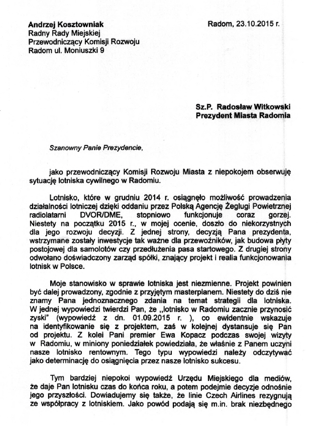 Prezentujemy również komentarz prezydenta Radosława Witkowskiego w tej sprawie - To ostatni, dosyć groteskowy akcent kampanii wyborczej. Z pisma, które otrzymałem od pana radnego Kosztowniaka, dowiedziałem się, że „Lotnisko funkcjonuje coraz gorzej”. Przypomnę, że w styczniu w kasie spółki brakowało na pensje dla pracowników, a z Sadkowa nie latały samoloty. Od tego czasu uruchomiliśmy połączenia lotnicze, a nowe władze spółki rozpoczęły proces restrukturyzacji. Czy tak wygląda „pogorszenie” działalności spółki? Nie wydaje mnie się - napisał prezydent.
