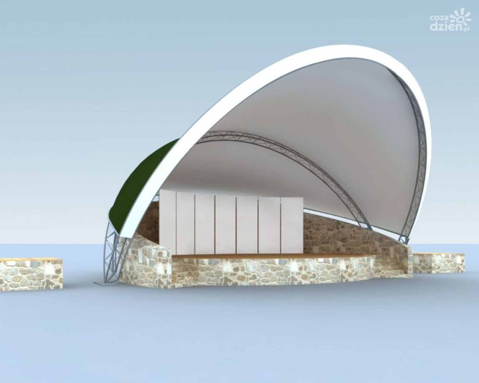 Opracowana przez Wojciecha Gęsiaka koncepcja jest zgodna z tą, która 19 lat temu wygrała konkurs architektoniczny. Bryłę muszli będzie stanowiła kamienna ściana kurtynowa okalająca scenę i stanowiąca z jednej strony podporę pod stalową konstrukcję napinającą membranę dachu. Muszla ma mieć wymiary 12 x 8,3 m. przy wysokości 6,7 m. Plac przed sceną zostanie utwardzony i zostanie tam ustawionych 50 ławek. Bezpieczeństwo zapewnią trzy kamery przesyłające obraz do centrum monitoringu.