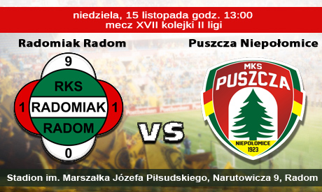 12.30 Ze Stadionu Miejskiego w Radomiu wita Państwa Krzysztof Domagała. Zapraszamy do śledzenia relacji LIVE ze spotkania 17. kolejki II ligi piłki nożnej pomiędzy Radomiakiem Radom a Puszczą Niepołomice. Pierwszy gwizdek sędziego powinien zabrzmieć dokładnie o 13.00.