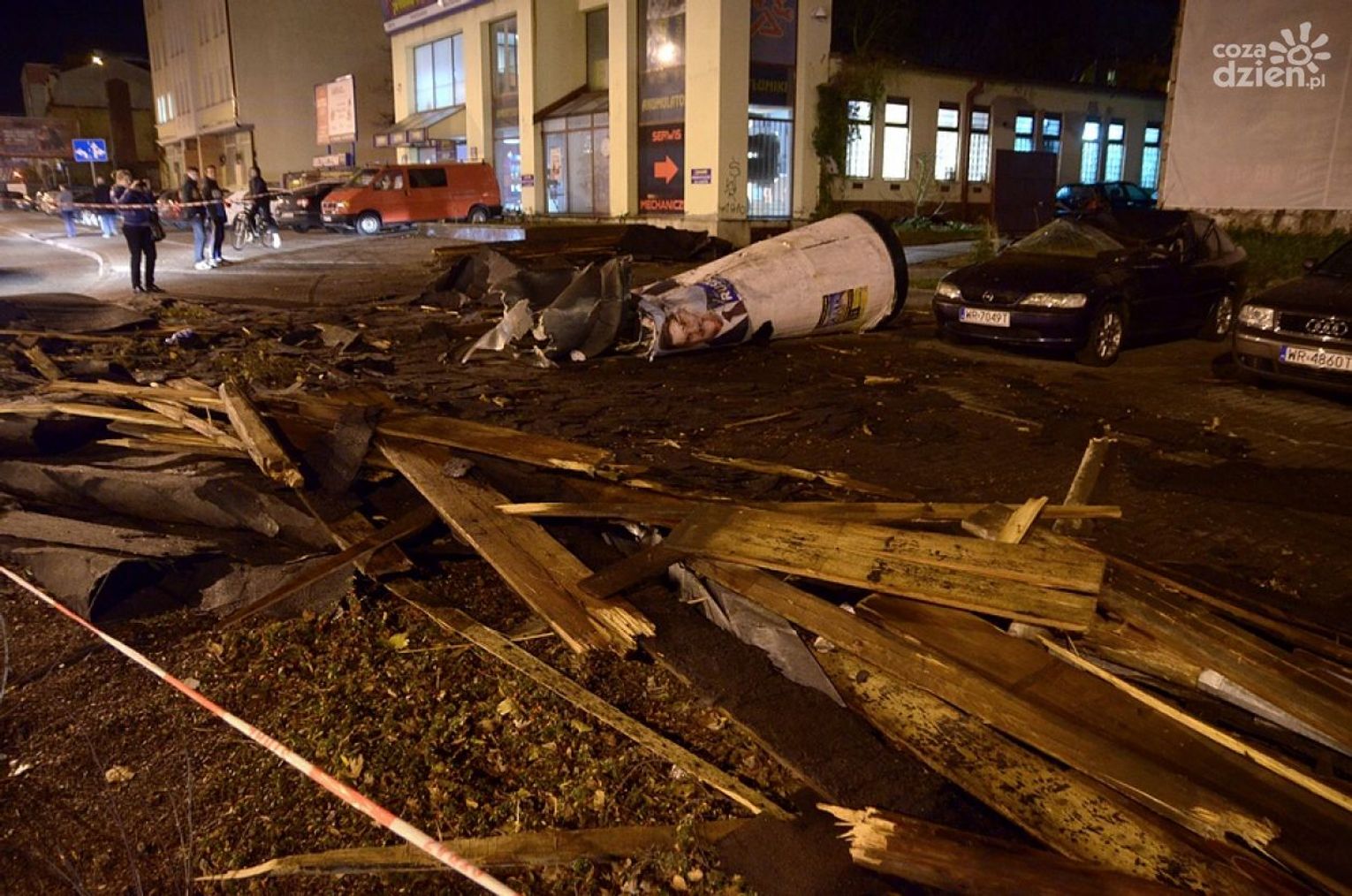 Podmuch wiatru zerwał dach z opuszczonego budynku, przy ul. Kelles-Krauza 12. Fragmenty konstrukcji spadły na samochody zaparkowane w okolicy. Uszkodzone są trzy auta. Nie było tam w tym momencie pieszych. Na ul. Niedziałkowskiego złamało się drzewo, które spadło na samochód. W okolicy pl. ks. Kotlarza złamał się konar z drzewa i wpadł do samochodu, w środku prawdopodobnie było dziecko.