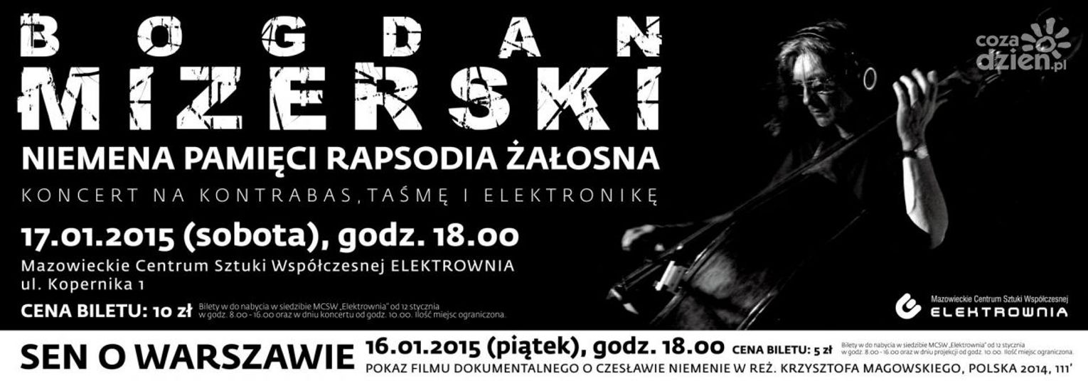 17 stycznia (sobota) o godzinie 18.00 odbędzie się koncert „Niemena Pamięci Rapsodia Żałosna” w wykonaniu Bogdana Mizerskiego, który w swojej twórczości łączy brzmienie kontrabasu z elektroniką. Jednocześnie, muzyk nie ukrywa, że w swojej twórczości inspiruje się muzyką Czesława Niemena. Stąd też tytuł koncertu, który jest odniesieniem do Bema Pamięci Rapsodu Żałobnego Niemena oraz III Symfonii Pieśni Żałosnych Henryka Mikołaja Góreckiego. Muzyk zaprezentuje także swój tekst poetycki, złożony z wybranych tytułów utworów Niemena, oraz foto wizualizację. Bogdan Mizerski urodził się 27 marca 1955 roku w Sosnowcu. W swojej muzyce często eksperymentuje łącząc kontrabas z elektroniką. Jego koncerty są wyjątkowe ze względu niezwykłą oprawę. Mizerski zajmuje się również poezją, którą w unikalny sposób wiąże z muzyką.