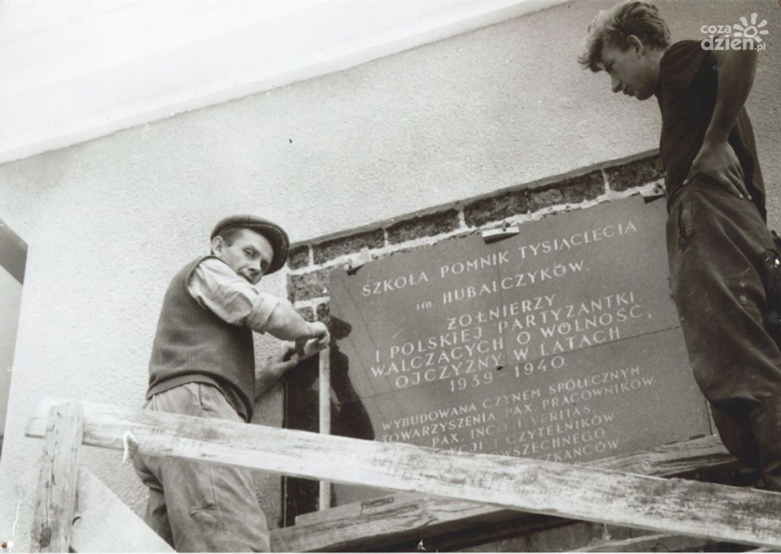 Na zdjęciu: Szkoła Podstawowa w Ruskim Brodzie - Montaż tablicy poświęconej fundatorom (ze Stowarzyszenia PAX) przed otwarciem szkoły w dniu 18 IX 1960 r. Fot. ze zbiorów PSP w Ruskim Brodzie.