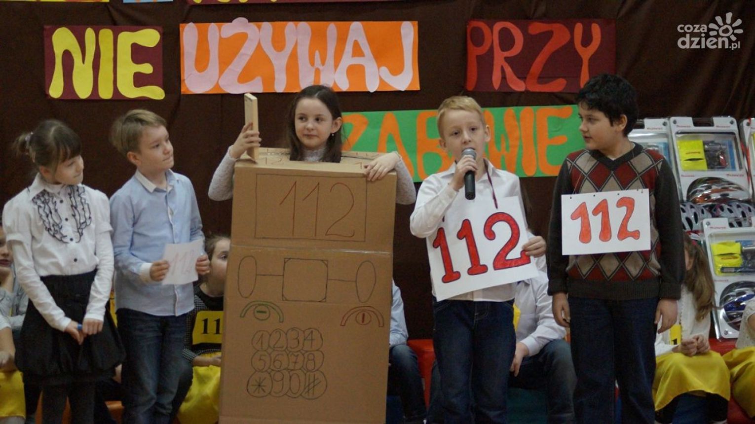 Kolejną część akademii uświetnili uczniowie klasy 3b i 2c prezentując hasła promujące numer 112, śpiewając piosenkę „Dzwoń, dzwoń, dzwoń….” oraz odgrywając scenkę darmową pt. „Jak mama Natalki przy stole zemdlała…”. Przedstawiony przez małych aktorów program artystyczny, był swoistą lekcją wzywania służb ratunkowych oraz udzielania pierwszej pomocy. Był lekcją, która zakończyła się sukcesem, gdyż uczniowie będący widzami poprawnie odpowiedzieli na wszystkie pytania quizowe, które zadała im pani policjantka.