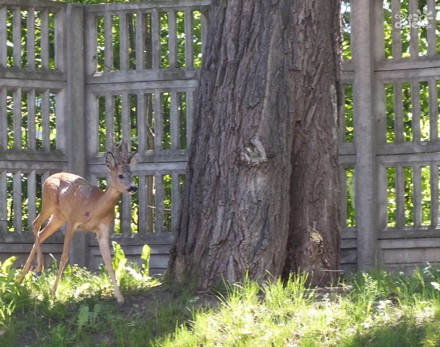Okazuje się, że zgłoszenia o tym, że sarna biega po placu, były już wcześniej, z terenu pobliskiego skupu złomu. Strażnicy Miejscy obiecują, że skonsultują sprawę. - Powiedzieli, że nie mogą ot tak przyjechać, bo taka sarna to niezwykle płochliwe i delikatne zwierzę, i jak się będzie je ganiać, to dostanie zawału serca i umrze - mówi pracownica recepcji. - Chce pan zobaczyć sarenkę? Biega na parkingu. Idziemy do tylnego wyjścia. Rzeczywiście, na trawniku obok ogrodzenia przemyka jelonek. Próbuje znaleźć wyjście. Zdarza się, że ciekawie zerknie w stronę ludzi. Fotogeniczne zwierzę, ładnie wychodzi na zdjęciach, z czego korzystamy, starając się go nie płoszyć. Jest 11.30.
