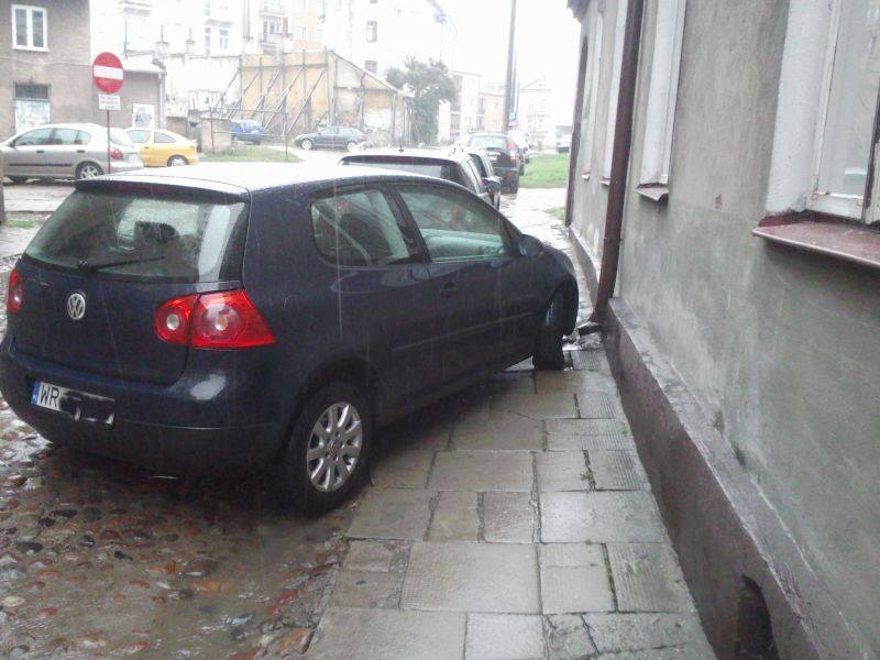 Październik: Genialnie zaparkowany, zastawiający cały chodnik golf na ulicy Wąskiej. (fot. Arek)