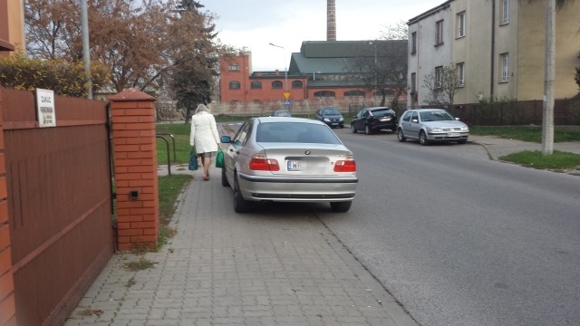 Listopad: "Beemkę" parkuję się tak - trzema kołami na chodniku. Piesi oczywiście mają pozostawione "ustawowe" 1,5 m przejścia. Szkoda, że jedynie po jezdni. W tle drugi specjalista - pozostawiony tuż przy znaku B-35 (zakaz postoju). (fot. Bezmyślni kierowcy w Radomiu)