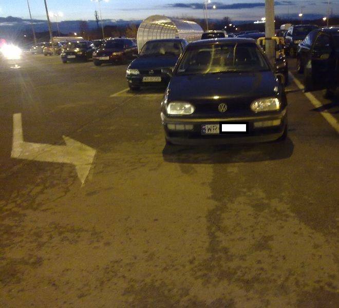 Listopad: "Przecież nie można przejść 10 metrów więcej, tylko trzeba utrudniać innym wyjazd z parkingu... Około godziny 16:30 czekałem na dziewczynę w aucie. W między czasie podjechał Pan w golfie i zaparkował sobie tak oto auto. Dodam, że byłem w samochodzie i z wymownym spojrzeniem oglądałem wyczyny parkowania. Pan spojrzał na mnie po czym zaparkował "na odwal się", wysiadł z auta i poszedł z rodziną na zakupy. A wolnych miejsc parkingowych w pobliżu wejścia było nawet wiele..." (fot. Łukasz)