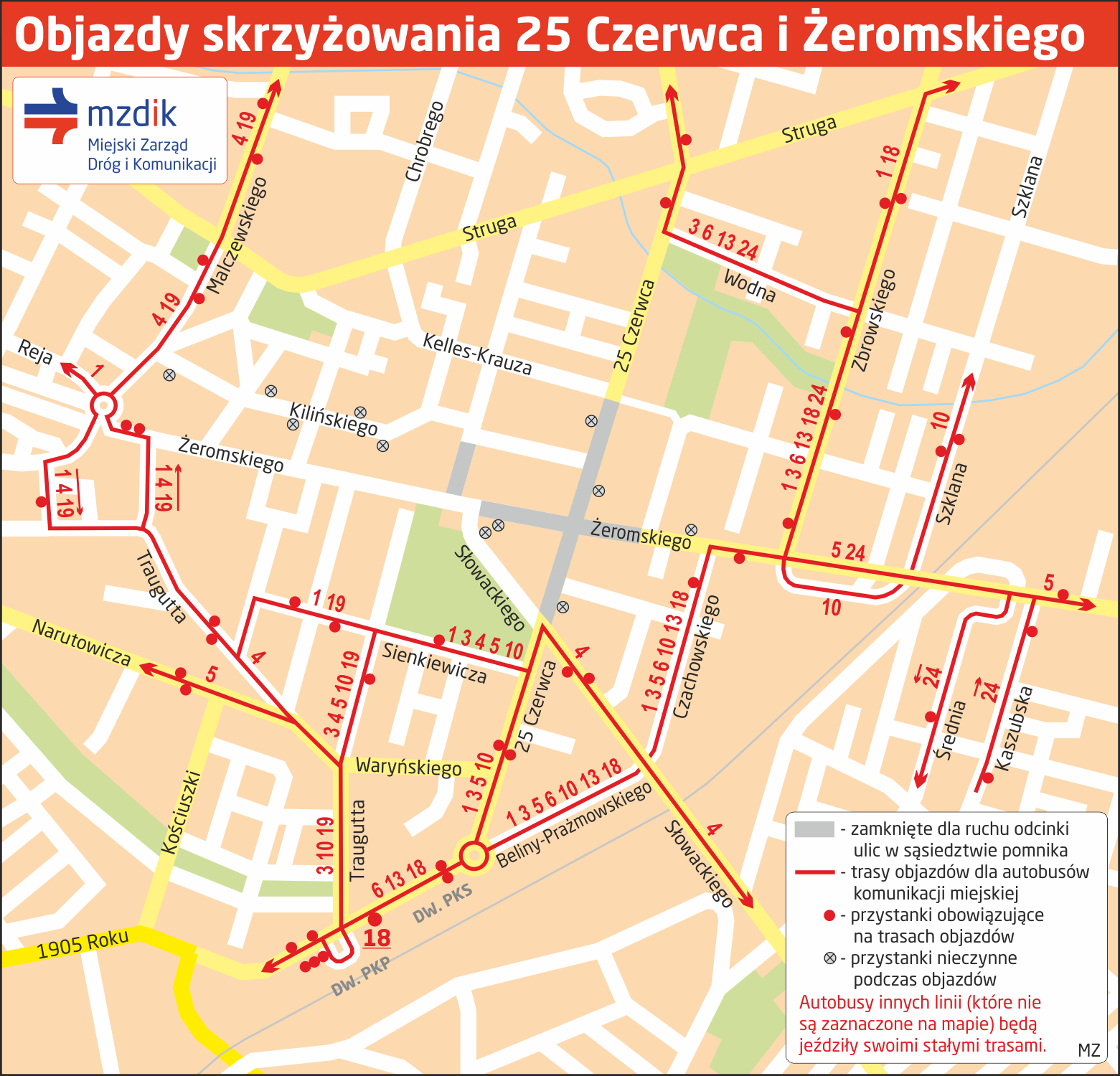 Na trasach objazdów będą obowiązywały wszystkie przystanki. Uruchomione zostaną także przystanki tymczasowe: Czachowskiego / Żeromskiego 01 (koło gmachu ZUS - dla linii 1, 3, 5, 6, 10, 13, 18) i Zbrowskiego / Żeromskiego 01 (przed skrzyżowaniem - tylko dla linii 24). Nieczynne będą przystanki: Żeromskiego / Czachowskiego 05 (w stronę 25 Czerwca), 25 Czerwca / Kaufland 04, 25 Czerwca / Skłodowskiej-Curie 03 i 06, Stańczyka / Malczewskiego (NŻ) 02, Kilińskiego / Focha 01 i 02, Kilińskiego / Urząd Miejski 03 i 04, Słowackiego / Żeromskiego 01, a także Żeromskiego / Słowackiego 02 (dwa ostatnie pozostają zawieszone w związku z wcześniej wprowadzonym objazdem dla linii 19).