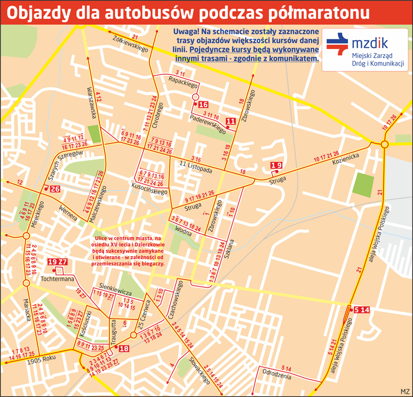 Autobusy komunikacji miejskiej wszystkich linii (oprócz 25 i Z23) będą kierowane na trasy objazdowe. Ze względu na to, że ich przebieg będzie uzależniony od miejsca, w którym akurat będą biegacze, poszczególne kursy będą wykonywane różnymi trasami. Szczegółowe informacje są dostępne oficjalnej stronie internetowej MZDiK: www.mzdik.pl. Jednocześnie MZDiK prosi, aby w dniu 22 czerwca w miarę możliwości unikać korzystania z indywidualnych pojazdów w godzinach około 10:00-13:00. Poruszanie się po Radomiu będzie wówczas poważnie utrudnione, szczególnie w Śródmieściu.
