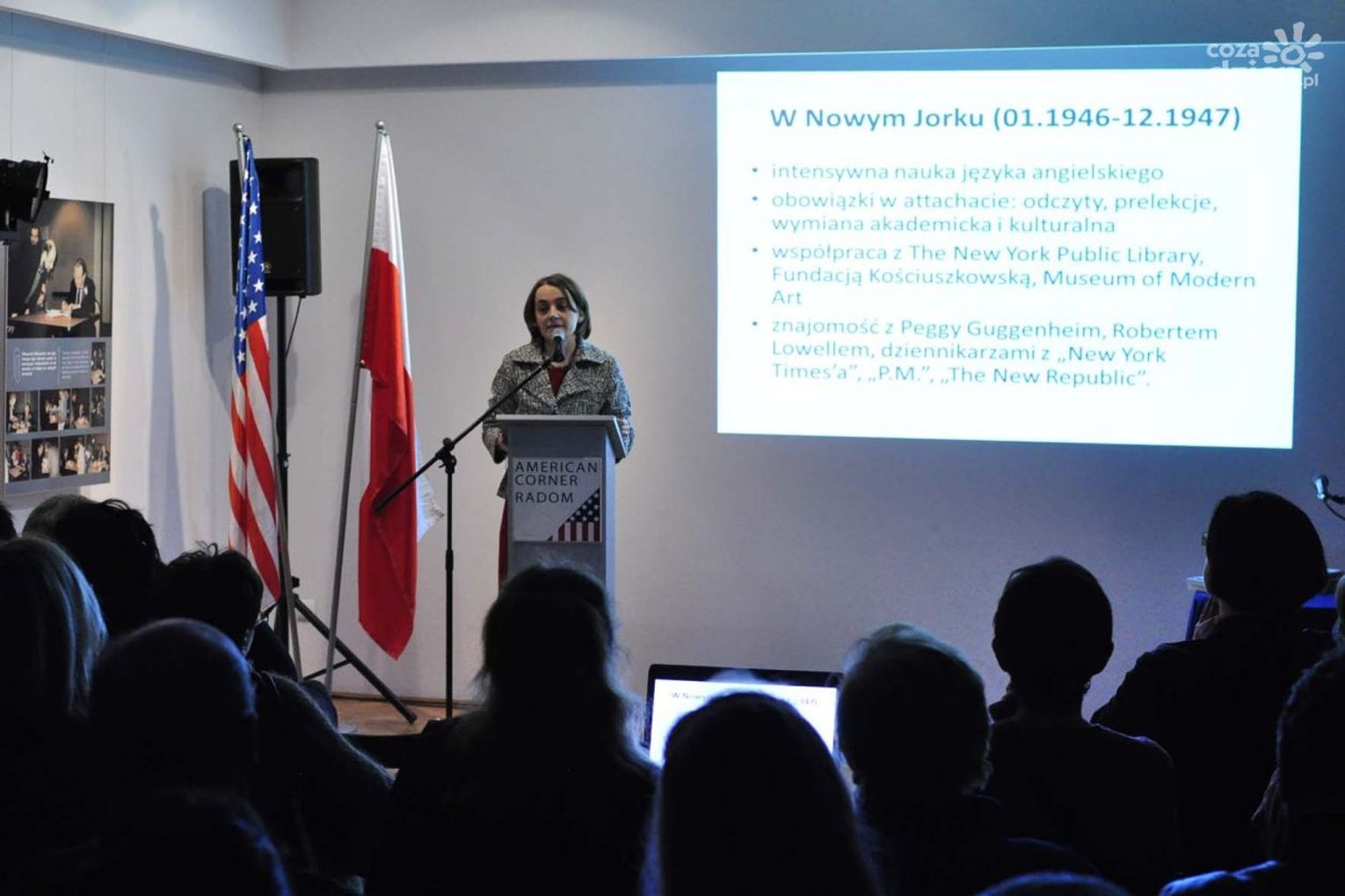 Na wernisażu wystawy „Miłosz po amerykańsku. Życie prywatne noblisty na fotografiach z archiwów Andrzeja Milosza i Adama Lizakowskiego” o amerykańskich wątkach w twórczości Czesława Miłosza opowiedziała polonista, ekspert od Miłosza, dr Ewa Kołodziejczyk. Wiersze poety goście usłyszeli w interpretacji aktora Teatru Powszechnego im. Jana Kochanowskiego Kamila Woźniaka.