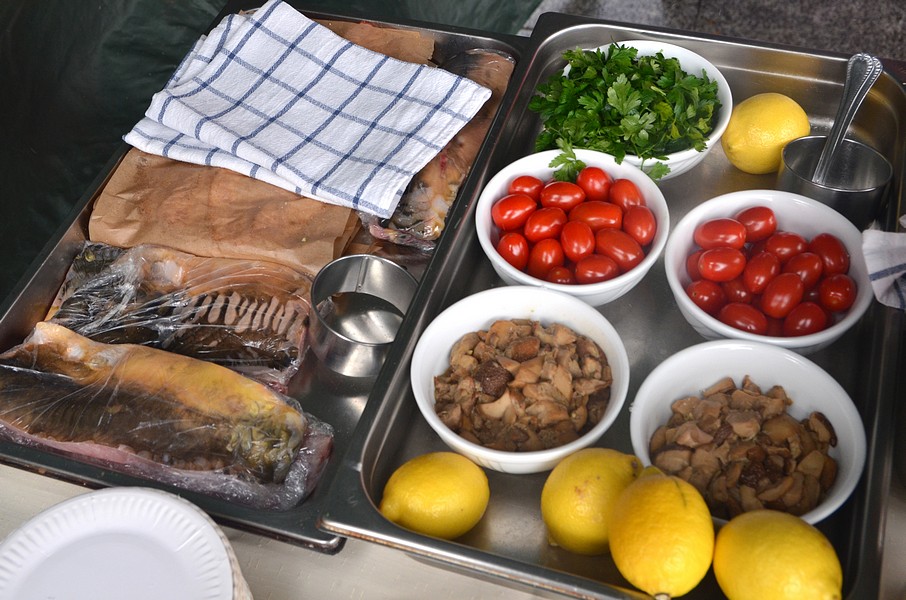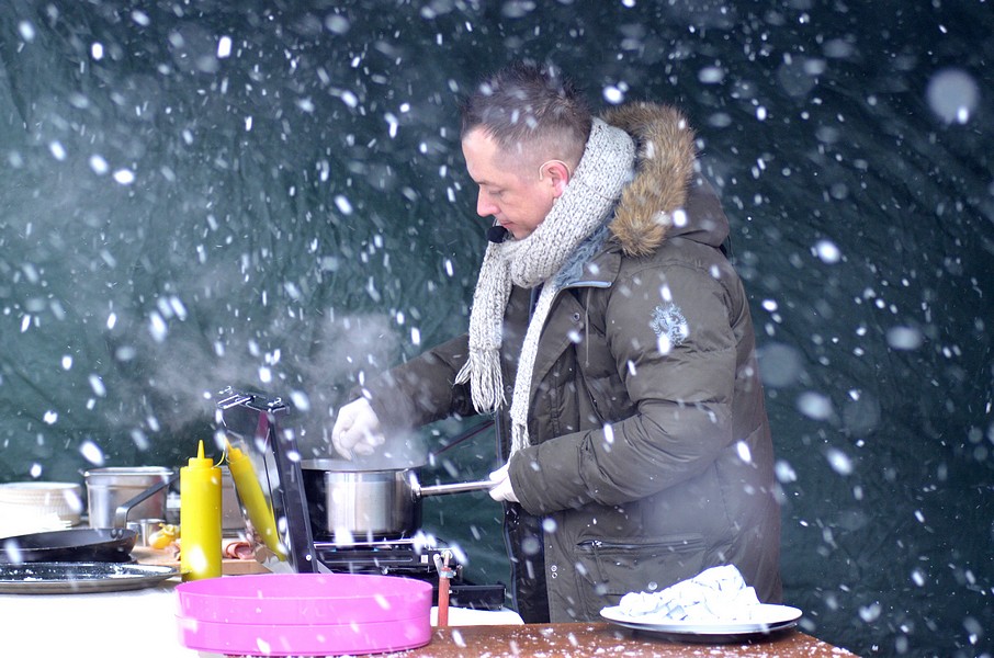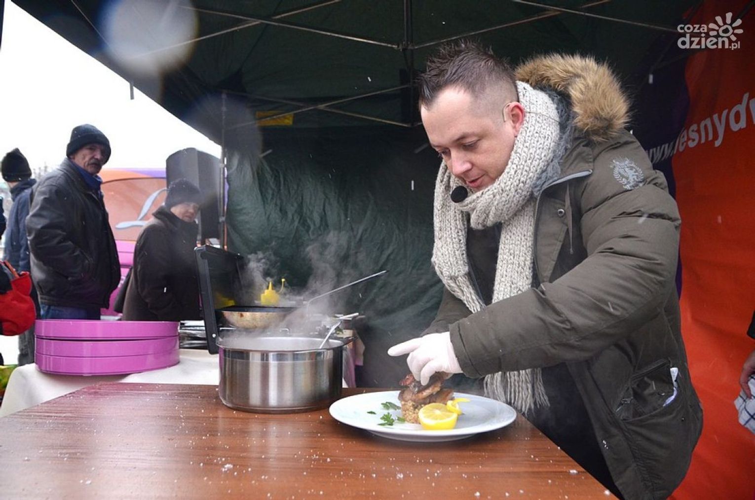 pokaz gotowania na żywo. Wiało i sypało śniegiem, a oni pokazali, jak zrobić pysznego karpia w boczku.