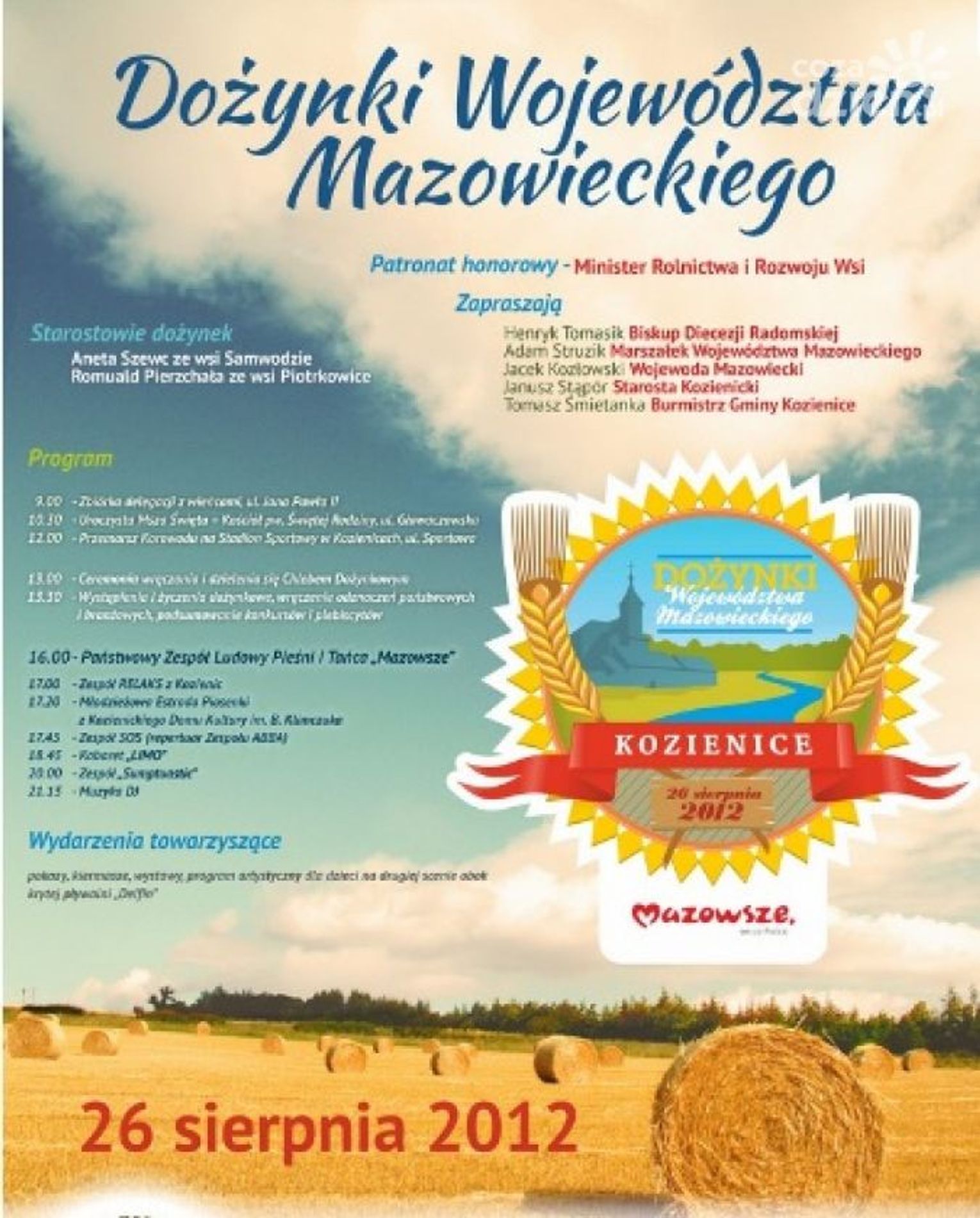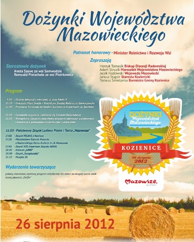 To już drugie dożynki województwa mazowieckiego, które są organizowane w powiecie kozienickim. Pierwsze odbyły się 10 lat temu. Tym razem realizowane są one w ramach projektu „Powiat Kozienicki Stolica Kultury Mazowsza 2012”. W dożynkach wojewódzkich wezmą udział przedstawiciele parlamentu RP, Sejmiku, Zarządu Województwa Mazowieckiego, Wojewody Mazowieckiego oraz delegacje wszystkich powiatów województwa mazowieckiego, instytucje i firmy związane z rolnictwem.