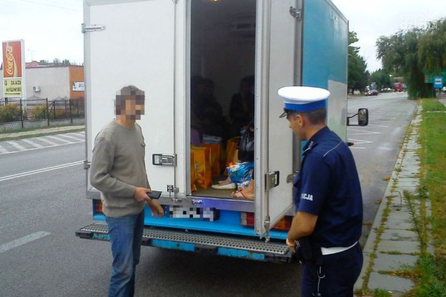 W Białobrzegach na ulicy Krakowskiej policjanci Wydziału Ruchu Drogowego zatrzymali do rutynowej kontroli dostawczego mercedesa. W jej trakcie zachowanie kierowcy wzbudziło w funkcjonariuszach podejrzenia. Kierowca został poproszony o otworzenie skrzyni ładunkowej. Zaskoczeni policjanci stwierdzili, że wewnątrz pojazdu, w chłodni przewożonych jest aż 16 osób.