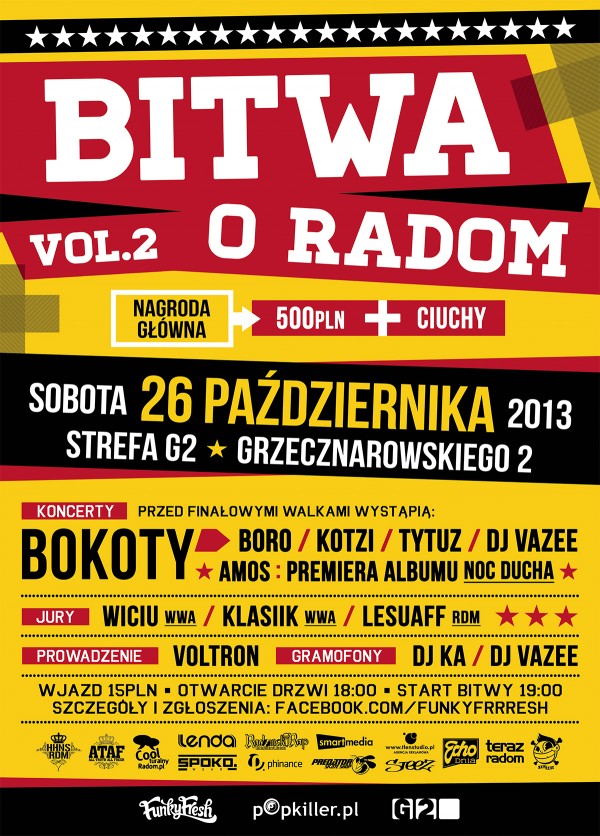 Walka rozpocznie się o godz. 19:00. Wjazd po 15 zł. Po 21 zagrają BoKoTy (Boro, Kotzi, Tytuz) i DJ VaZee - także kawałki ze swoich wszystkich poprzednich projektów (B.A.N.D.A. Unikat, Le Fruit Defendu, Kotzi - RapDom). Support zapewni AMOS.