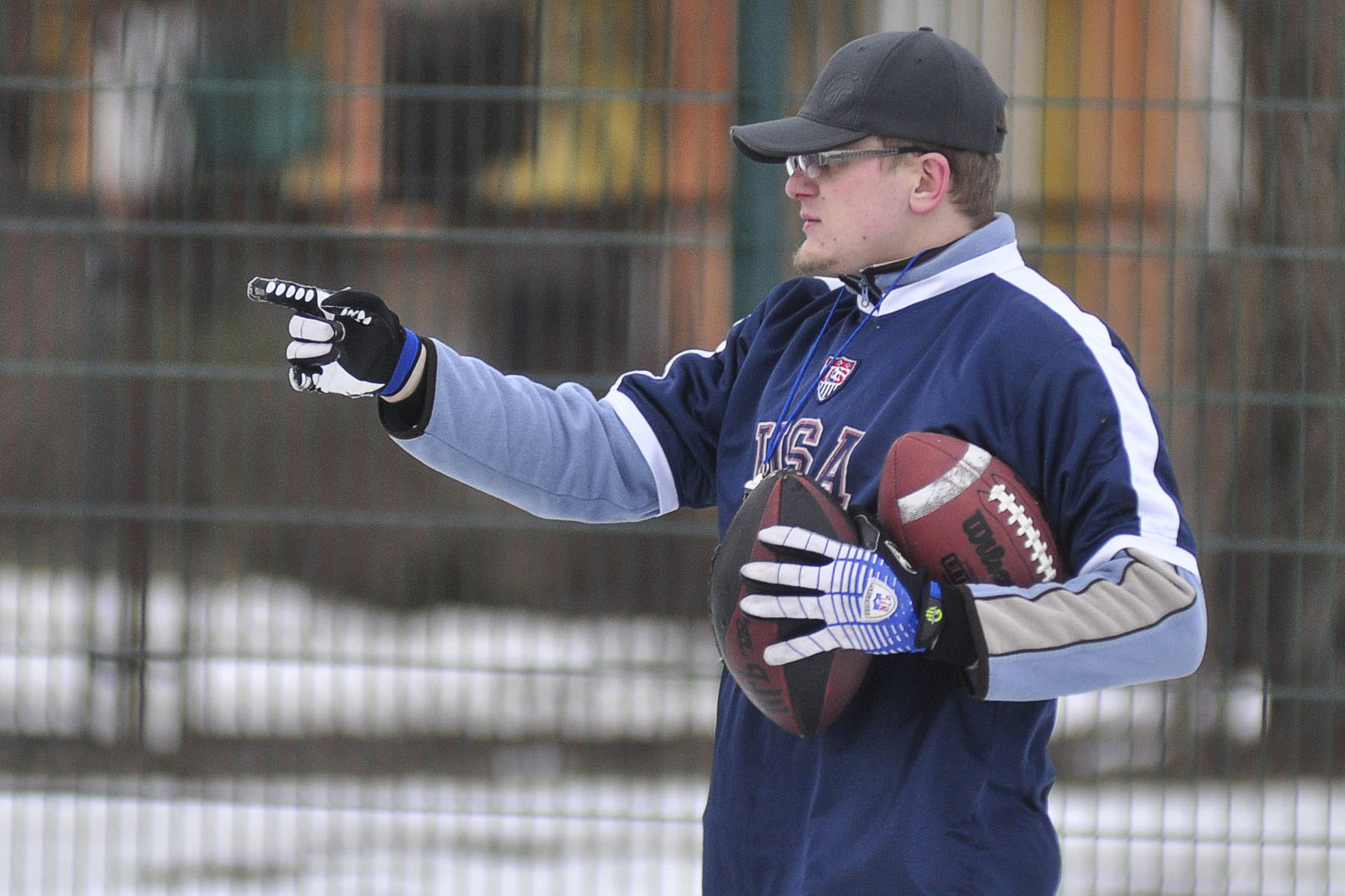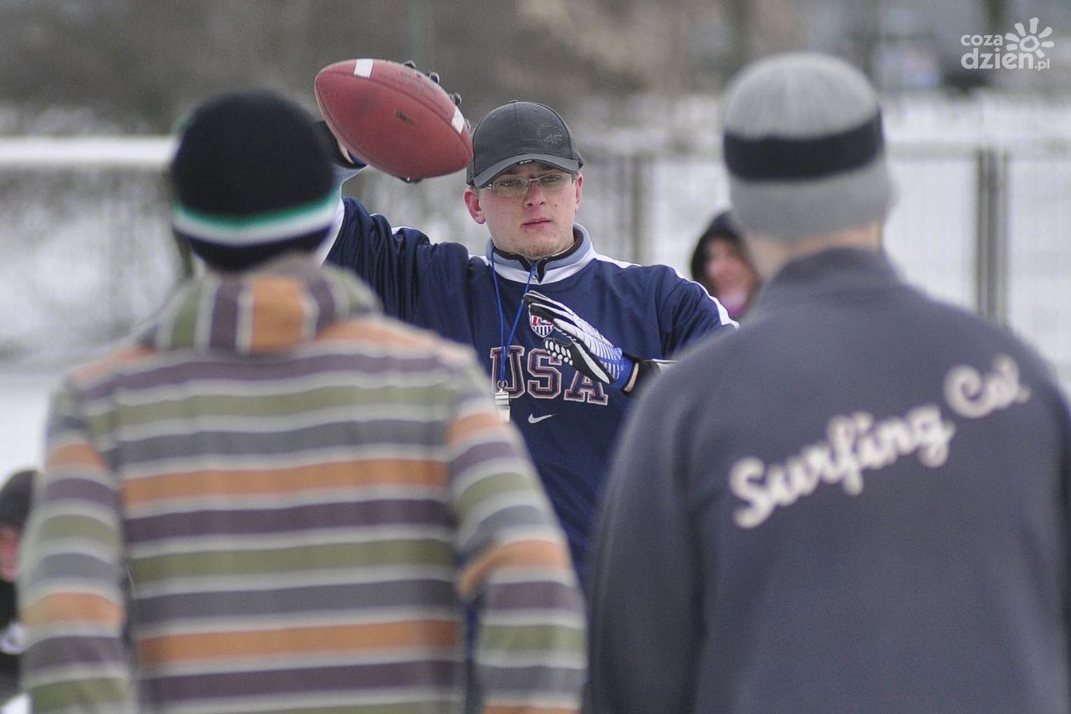 Na zdjęciu Paweł Jankowski (były zawodnik Radom Rocks), który przeprowadził trening dla przyszłych zawodników Greenducks Radom.Punktualnie o 16:00 rozpoczął się czwartkowy (28 marca) trening na zaśnieżonym boisku przy Publicznej Szkole Podstawowej nr 8 w Radomiu. Mimo mocnego wiatru oraz ujemnej temperatury na dworzu, po raz kolejny zajęcia przygotowane przez Greenducks Radom cieszyły się dużą frekwencją.