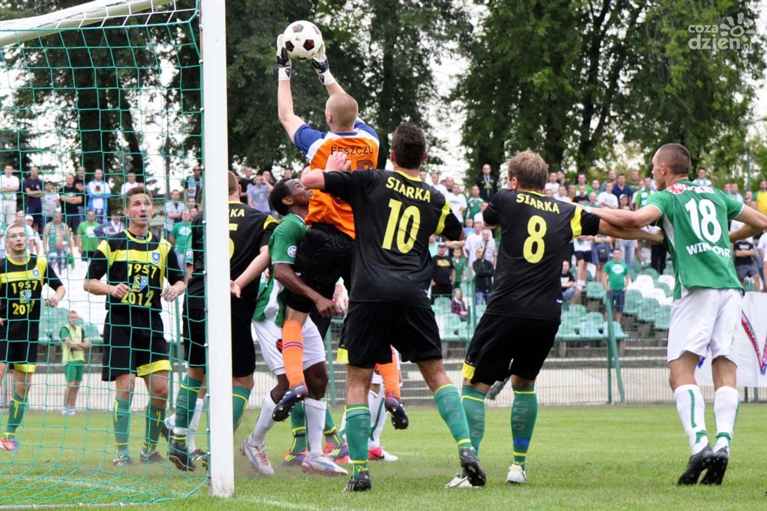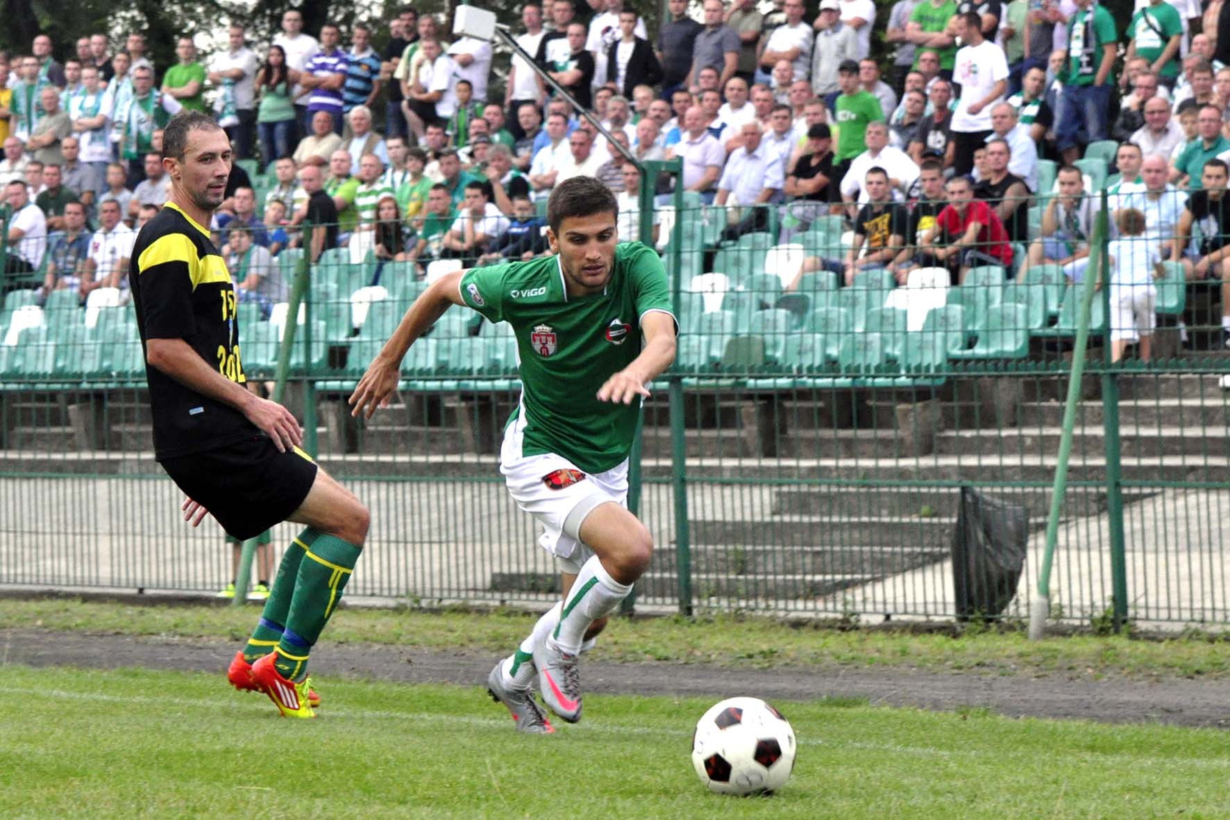 Na zdjęciu biegnący w stronę piłki Piotr Kornacki (zielona koszulka), który w wyjazdowym meczu z Siarką, strzelił rywalowi dwie bramki.