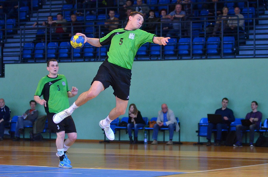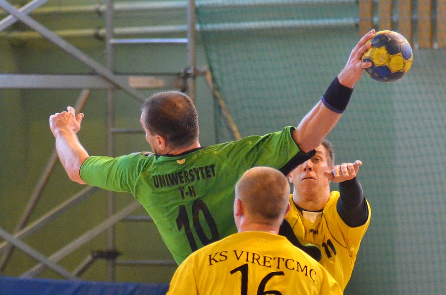 Podopieczni trenera Romana Trzmiela zanotowali bardzo dobry początek. Już po dwóch minutach prowadzili 3:0. Potem utrzymywali dobrą dyspozycje i utrzymywali przewagę. Przy stanie 8:7 świetną akcje przeprowadzili gospodarze. Maciej Jeżyna podawał ze skrzydła do Michała Kality, a ten w bardzo ładny sposób wpakował piłkę do bramki. Chwilę później Akademicy przeprowadzili skuteczną kontrę zakończoną rzutem Pawła Przykuty. Swoje dołożył także Grzegorz Mroczek i było 11:7. Radomianie nie ustrzegli się jednak prostych strat, po których bramki zdobywali goście, jednak w dalszym ciągu utrzymywali sporą przewagę. Po dwudziestu minutach pierwszej połowy było 16:10. Gospodarze w pewnym momencie nieco spuścili z tonu, dzięki czemu przyjezdni zbliżyli się na dystans trzech bramek (17:14). Wtedy o czas poprosił szkoleniowiec AZS UT-H. Zaraz po nim do siatki trafił Paweł Przykuta. W końcówce bardzo ładnym rzutem popisał się Grzegorz Mroczek, a piłka odbiła się jeszcze od poprzeczki i wpadła do bramki (21:17). Potem kontratak gości zatrzymał Piotr Bury. Do przerwy radomianie rzucili jeszcze dwie bramki.