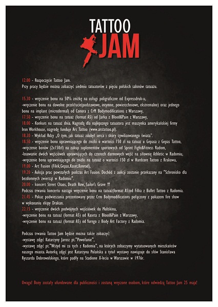 "Tattoo Jam" to kontynuacja imprezy "Tatuaż - wystawa fotografii", która odbyła się w Radomskim Klubie Środowisk Twórczych "Łaźnia" w 2008 roku. Na następną tatuatorską imprezę w Radomiu musieliśmy czekać aż 5 lat, więc takiego wydarzenia nie można przegapić.