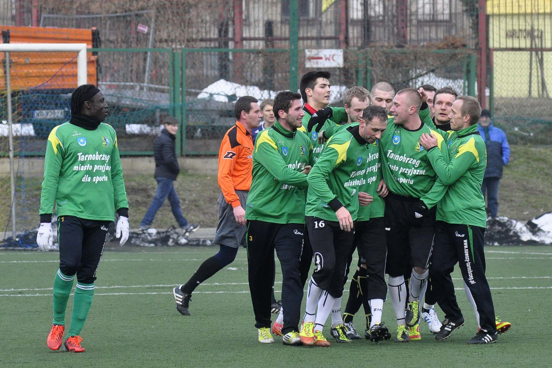 Już na początku spotkania dobrą sytuację mieli gospodarze, a konkretnieWojciech Kupiec, jednak jego strzał głową powędrował minimalnie nad poprzeczką. W 11 minucie niezłą okazję miał Mouhamadou Fall, który jesienią reprezentował barwy Broni, jednak i on przestrzelił. Po pół godzinie gry ładną akcję przeprowadził zespół z Tarnobrzega, a strzał Jana Kowalskiego zatrzymał się dopiero na poprzeczce bramki strzeżonej przez Pawła Młodzińskiego. Co nie udało się wtedy, udało się jedenaście minut później. Goście wykonywali rzut wolny, piłka została wybita przed pole karne, dopadł do niej Kowalski i ładnym strzałem po ziemi z siedemnastu metrów pokonał Młodzińskiego.