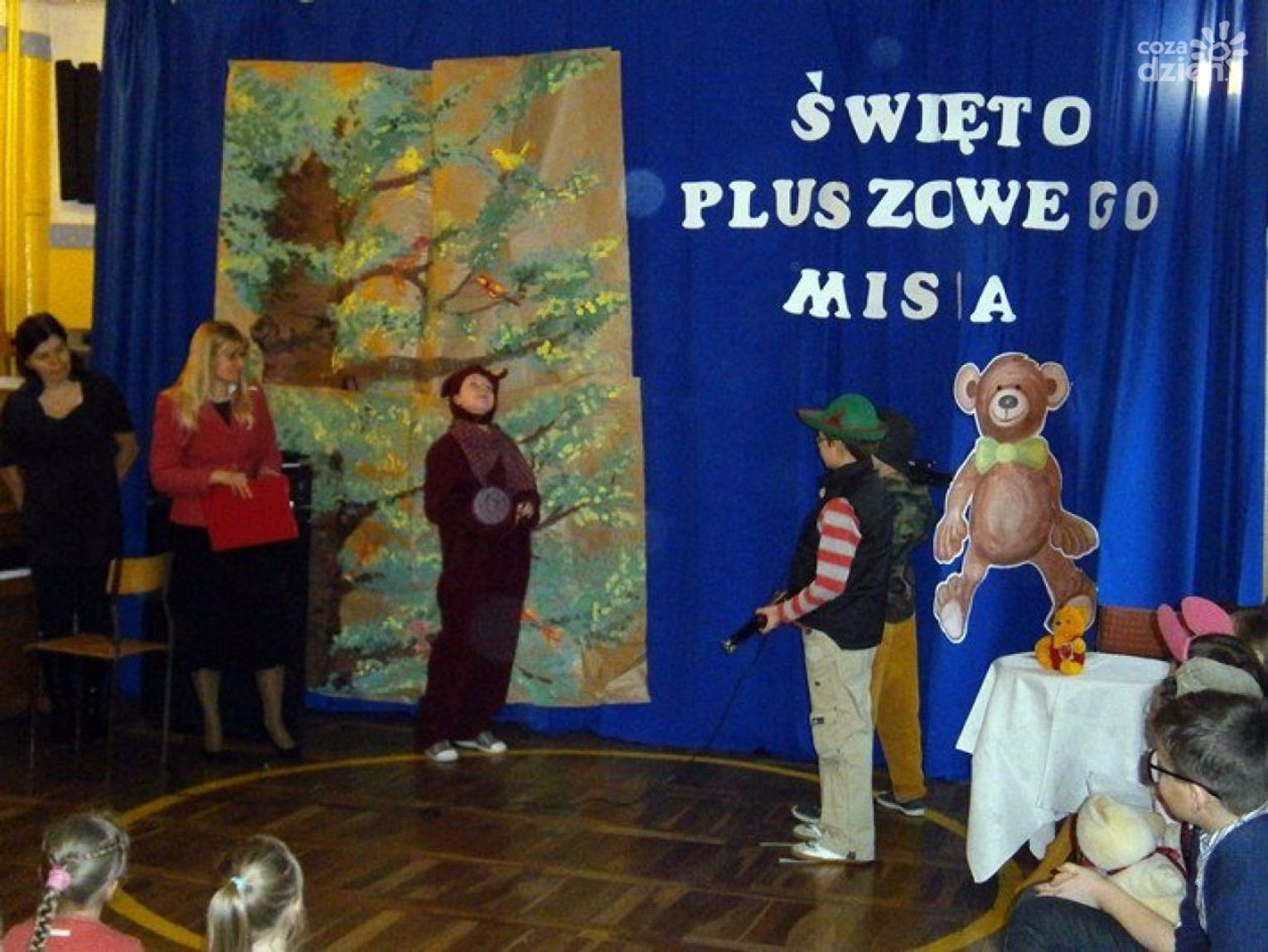 Co prawda, święto misia wypada w listopadzie, przedstawienie było jednak celowo opóźnione, gdyż dzieci czekały na misie od Świętego Mikołaja. Każdy z malców przyniósł swoją przytulankę, którą dzielnie trzymał w rączkach. W przedstawieniu uczestniczyły sześciolatki. Nauczycieli, przygotowujących spektakl dla maluszków, wspomagały dzieci ze starszych klas podstawowych.