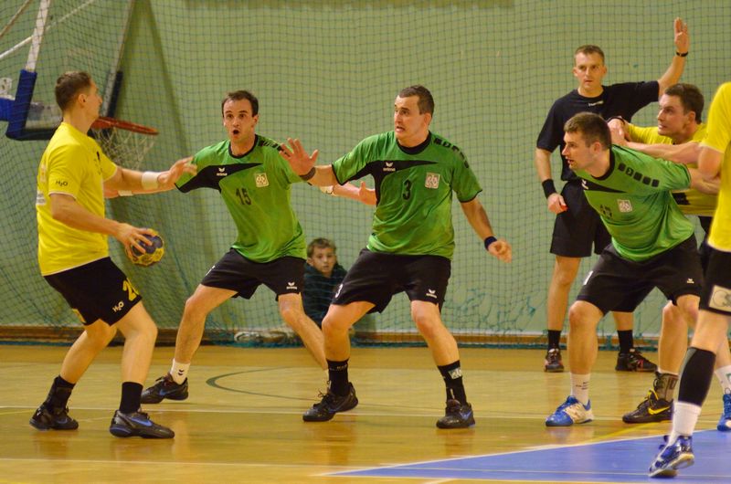 Po 23 minutach gry Michał Kalita nie wykorzystał wyśmienitej okazji, a rywale wyprowadzili skuteczny kontratak i doprowadzili do stanu (13:11). W ciągu kolejnych 2 minut „worek z bramkami” wyraźnie się otworzył i obydwie drużyny, co akcje zdobywały systematycznie kolejne bramki (16:14). W końcówce pierwszej połowy wspaniałymi interwencjami ponownie popisywał się Krzysztof Polit, który bez dwóch zdań był bohaterem pierwszych 30 minut meczu. Wynik pierwszej połowy, ustalił tuż przed syreną Łukasz Guzik i gospodarze zeszli na przerwę z przewagą czterech bramek (19:15).