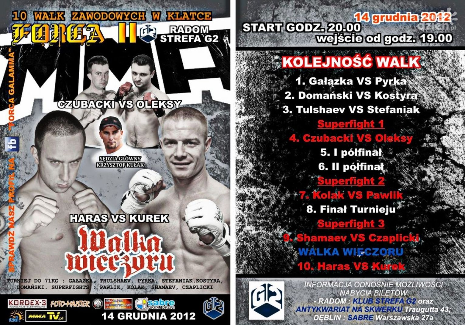 Gala w Strefie G2 odbędzie się 14 grudnia 2012roku. Wejść do klubu będzie można od godziny 19:00, pierwsza walka rozpocznie się o godz 20:00. Bilety na galę można nabyć w Strefie G2, Hula Park, oraz w Antykwariacie „Na Skwerku” ul. Traugutta 47.