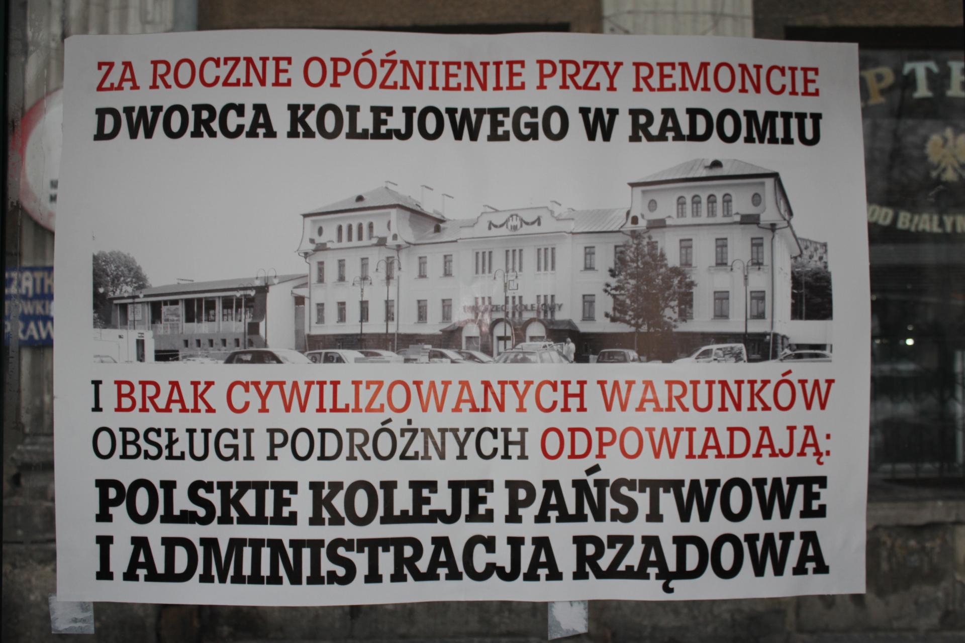 - Dwa tygodnie temu jechałem pociągiem z Radomia do Lublina. Byłem zmuszony do skorzystania z prowizorycznego dworca. Te warunki urągają pasażerom. Zaczepiła mnie tam kobieta, która w ostrych słowach zapytała, kto odpowiada za ten stan rzeczy, dlaczego dopuszczono do takiej sytuacji, że w zimę ludzie będą obsługiwani w takich warunkach i kiedy to się wreszcie skończy. Żeby dać ludziom konkretną odpowiedź, kto ponosi odpowiedzialność za remont zdecydowaliśmy się na wydrukowanie plakatów i rozwieszenie ich w pobliżu dworca. Pieniądze na tę kampanię pochodzą z prywatnej kasy - tłumaczył radny Jakub Kowalski.