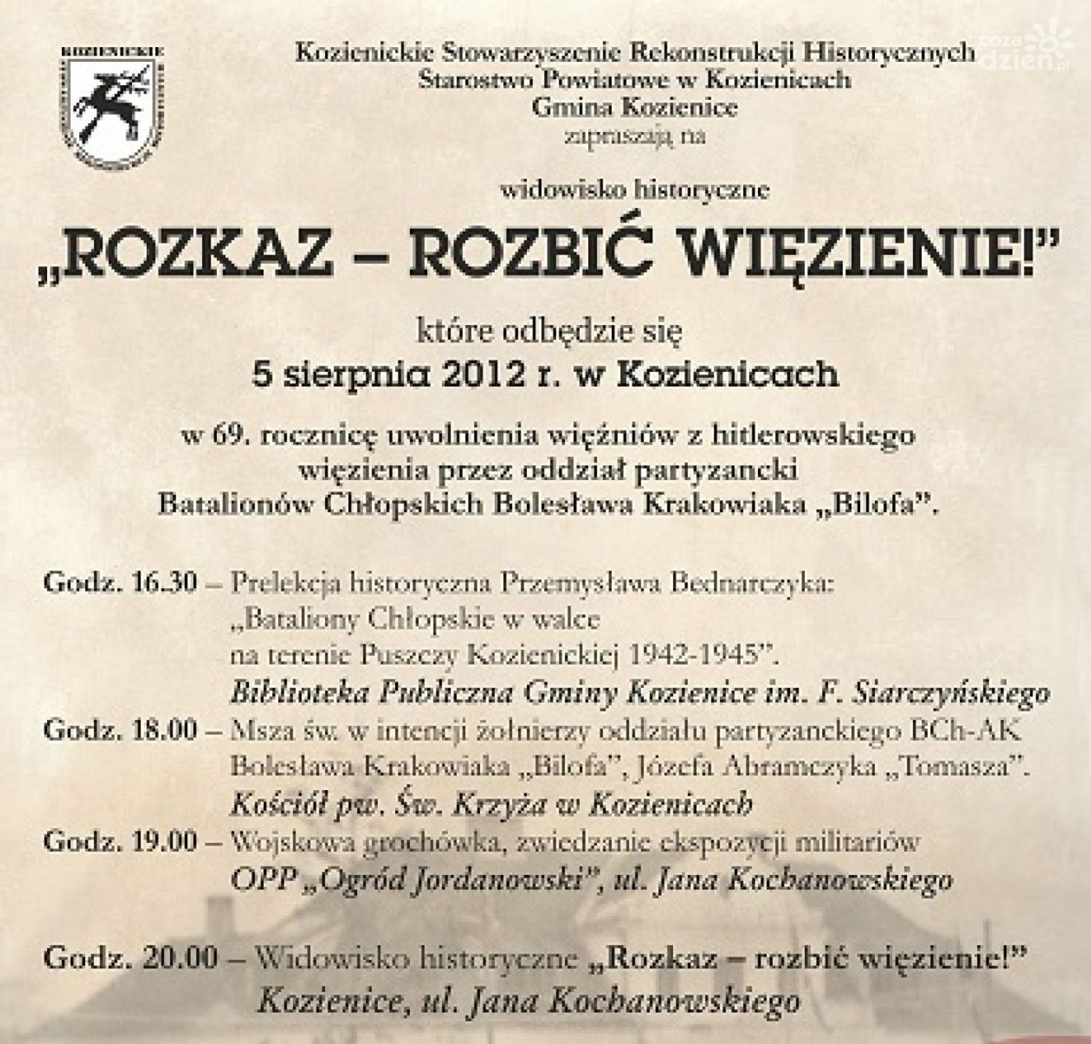 godz. 20.00 – Widowisko historyczne „Rozkaz – rozbić więzienie!” (Kozienice, ul. Jana Kochanowskiego)
