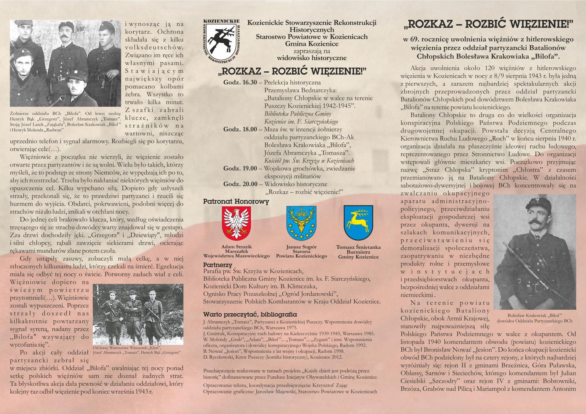 Podczas inscenizacji przedstawiony będzie m.in. jeden z elementów oporu i walki Polaków z niemieckim okupantem – odbicie hitlerowskiego więzienia 8 sierpnia 1943 r. przez oddział partyzancki Batalionów Chłopskich pod dowództwem Bolesława Krakowiaka „Bilofa”.
