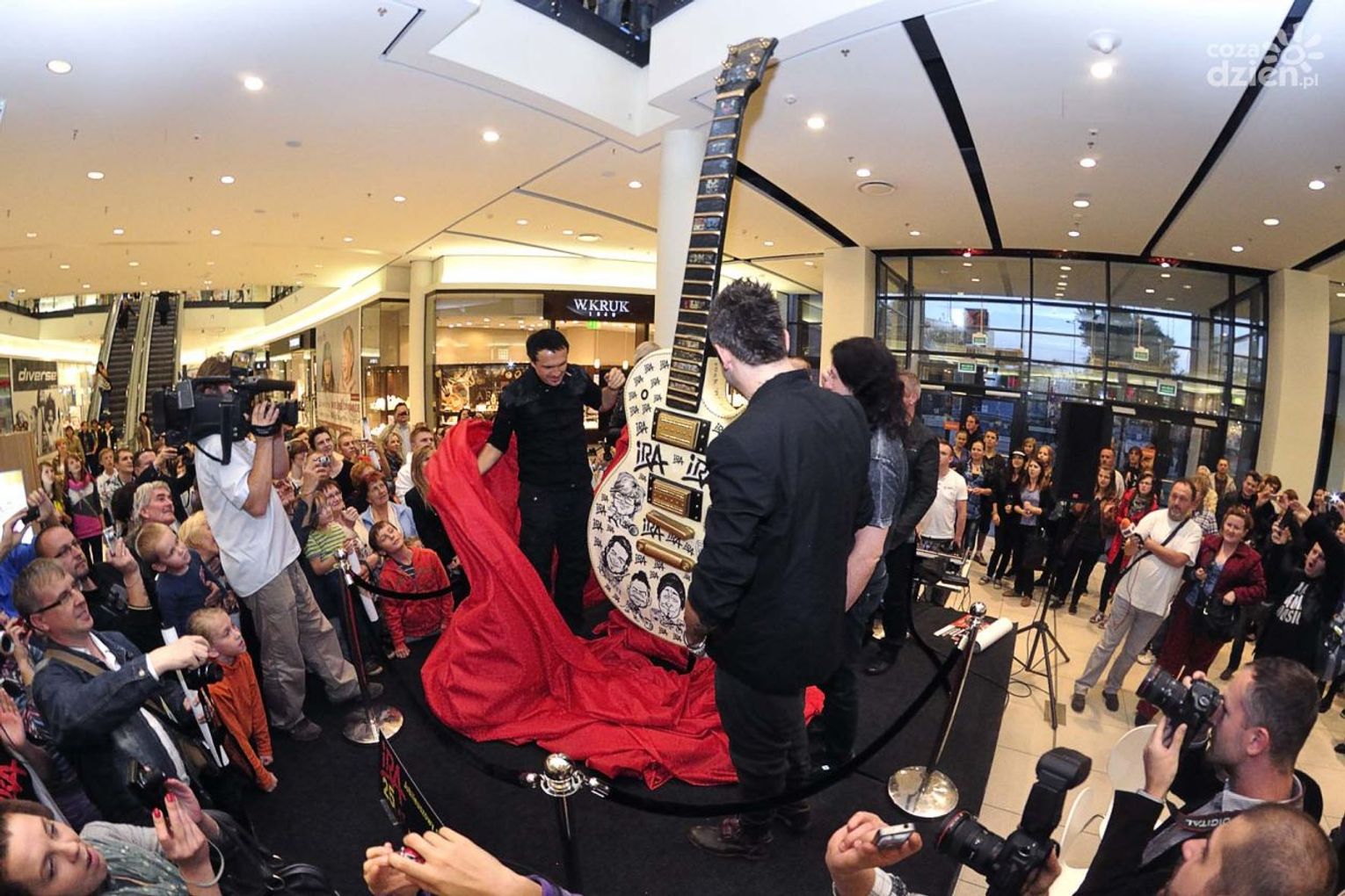 50- kilogramowy instrument wykonał ksiądz Valdemar Maciąg - fan zespołu, który pochodzi z Radomia, a na co dzień mieszka w amerykańskim Orlando. Na wielkim instrumencie dla zespołu IRA umieszczone są karykatury muzyków, gryf ozdabiają okładki płyt i singli zespołu. Czterometrowa gitara powstawała przez około 6 miesięcy.- Dwa lata temu dostałem od zespołu złotą płytę na moje czterdzieste urodziny. Gitara jest rewanżem za tamten prezent. W ten sposób chcę też podziękować zespołowi za przyjaźń i pozytywne emocje muzyczne - wyjaśnia ks. Valdemar Maciąg.