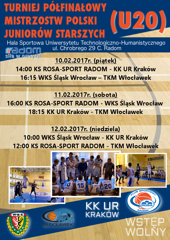 Klub Sportowy Rosa Sport serdecznie zaprasza wszystkich sympatyków koszykówki w dniach 10-12 lutego na halę sportową Uniwersytetu Technologiczno-Humanistycznego na Turniej Półfinałowy Mistrzostw Polski Juniorów starszych (U-20).