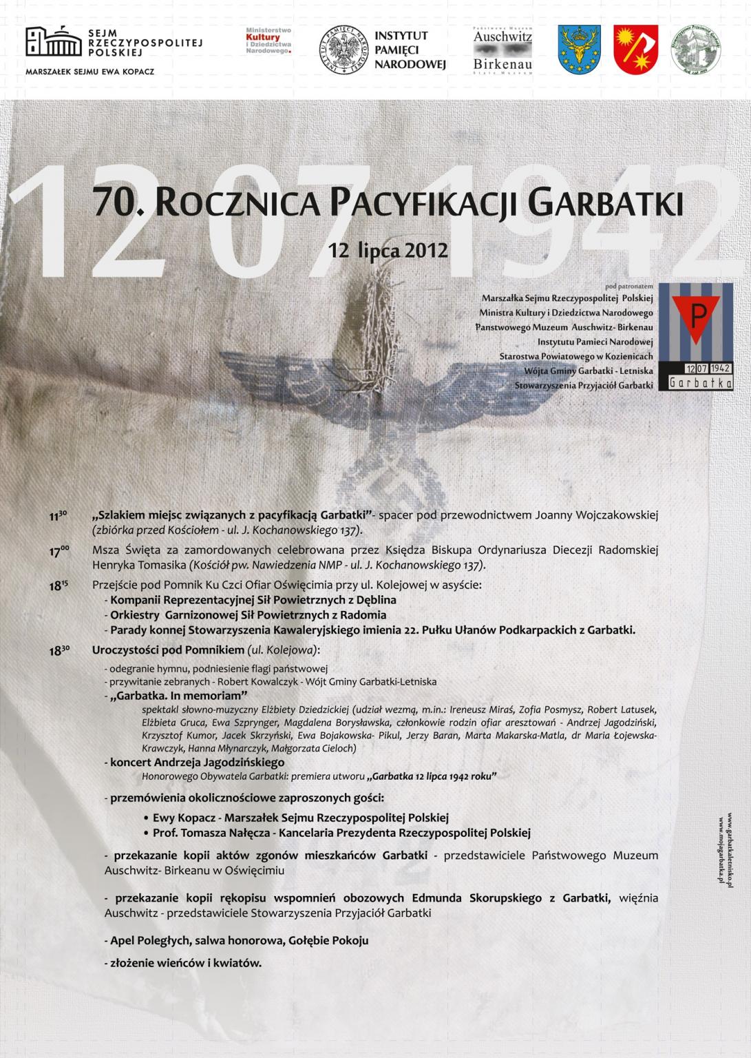 18.30 - uroczystości pod Pomnikiem: spektakl słowno-muzyczny "Garbatka. In memoriam"; koncert Andrzeja Jagodzińskiego, honorowego Obywatela Garbatki; przemówienia Ewy Kopacz i prof. Tomasza Nałęcza; przekazanie kopii aktów zgonów mieszkańców Garbatki i kopii rękopisów wspomnień obozowych Edmunda Skorupskiego z Garbatki, więźnia Oświęcimia; apel poległych i złożenie kwiatów pod pomnikiem ofiar.