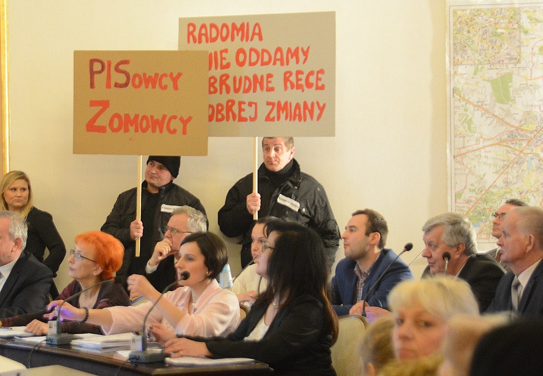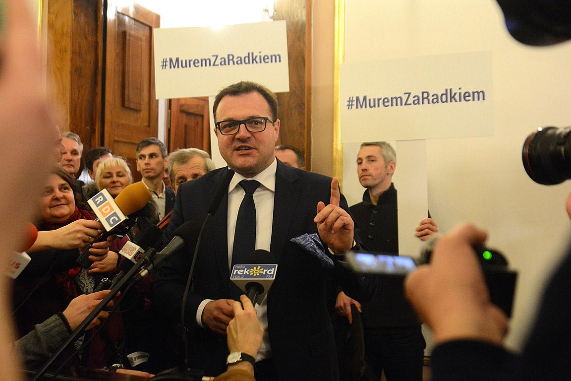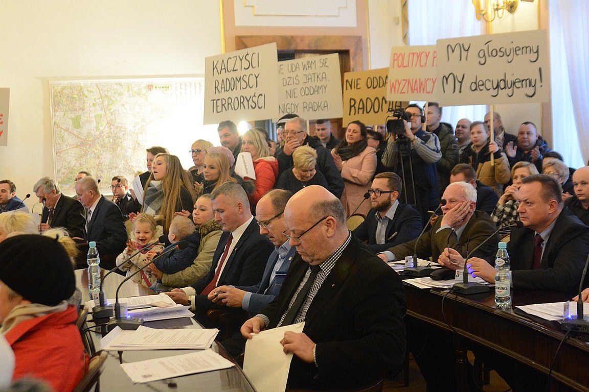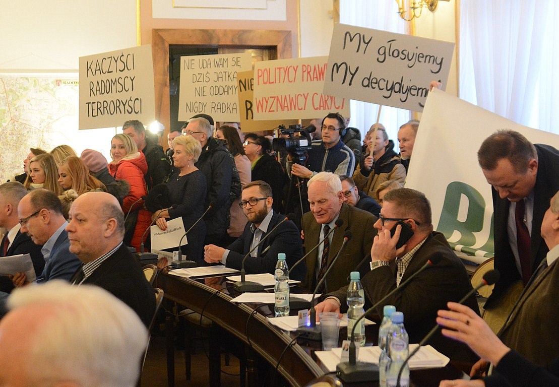 „Murem za Radkiem”, „CBA źródło zła”, „My głosujemy, my decydujemy”, „Radomia nie oddamy w brudne ręce dobrej zmiany”, „Nie uda wam się dziś jatka/ nie oddamy nigdy Radka” czy „PiS-owcy zomowcy” - z takim transparentami przyszli na posiedzenie rady, na którym miał być głosowany wniosek Centralnego Biura Antykorupcyjnego o wygaszenie mandatu prezydenta Witkowskiego, radomianie skupieni na facebookowym fanpage'u „Murem za Radkiem”. Nie wszyscy zmieścili się w sali obrad; część stała na korytarzu i na schodach. Prezydent został przez ponadstuosobową grupę powitany gromkimi brawami i okrzykami; „Ra-dek! Ra-dek!”.