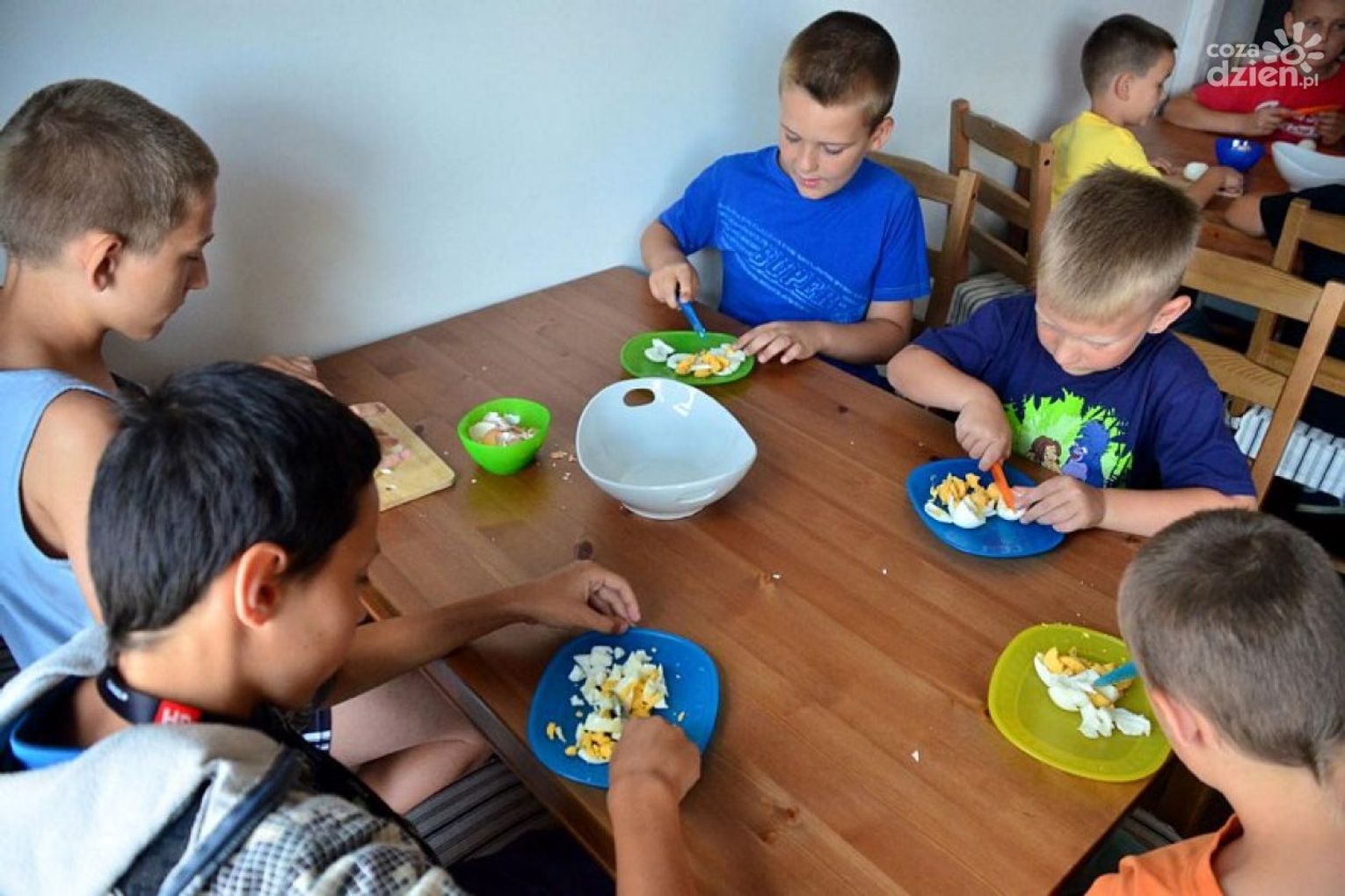 Odwiedziliśmy tę półkolonię podczas warsztatów edukacyjnych w Rodzinnej Restauracji MammaLeo, w których brała udział 16-osobowa grupa starszych chłopców. - Ostatnio dziewczynki robiły ciasteczka francuskie, a dzisiaj chłopcy naucza się robić pastę jajeczną – mówi Dorota Borycka, współwłaścicielka restauracji, prowadząca warsztaty. Chłopcy zostali podzieleni na cztery grupy - „restauracje” musieli również wybrać między sobą Szefa Kuchni. Pani Dorota poinstruowała wszystkich o obowiązujących przepisach BHP w przypadku korzystania z noża. Doradziła również jak rozpoznać jajko ugotowane od surowego, oraz pokazała sprytny sposób na obieranie ich ze skorupki. Po takim wstępie młodzi kucharze ochoczo zabrali się do pracy.