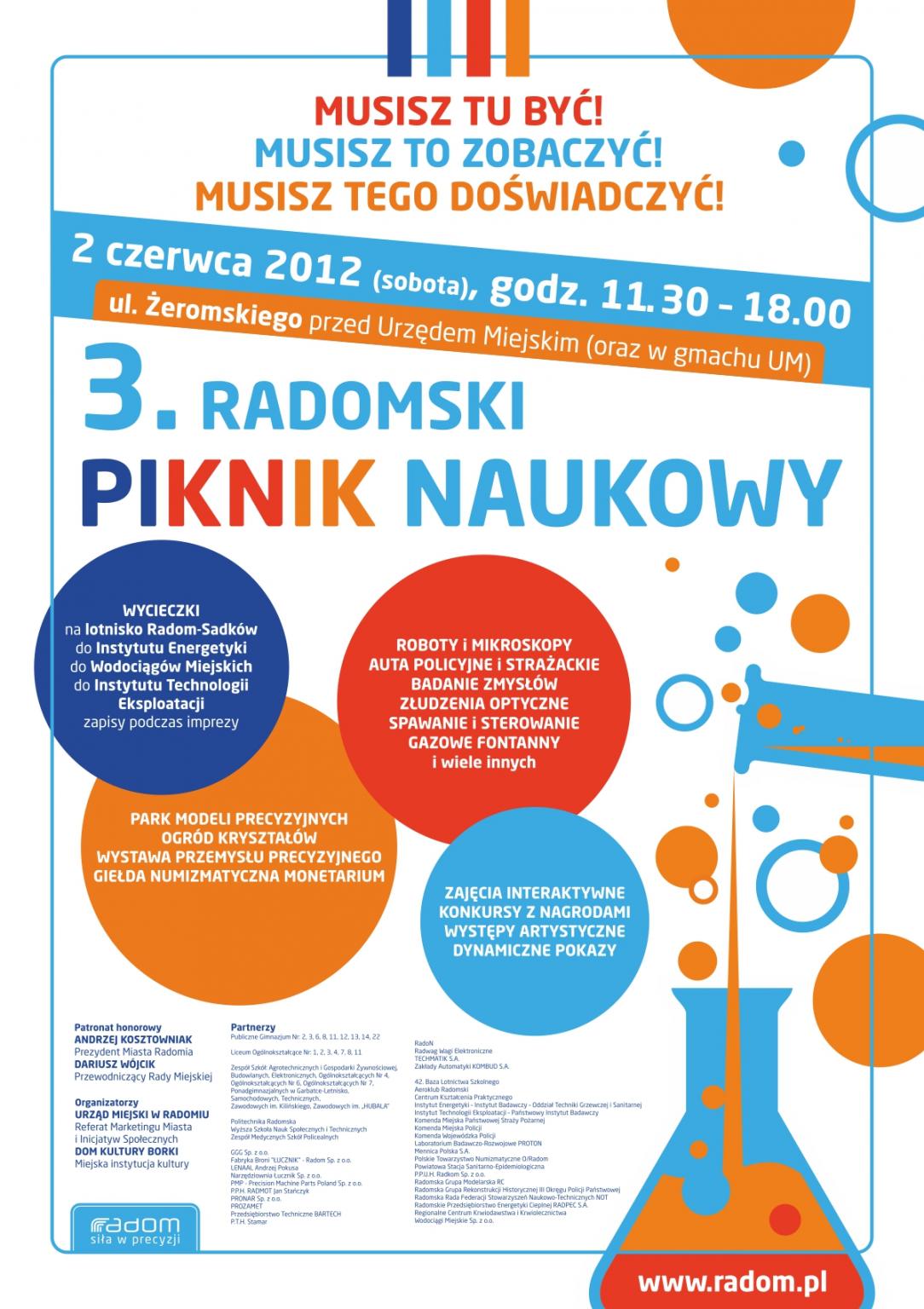Honorowy patronat nad tym wydarzeniem sprawuje prezydent Radomia Andrzej Kosztowniak oraz przewodniczący Rady Miejskiej Dariusz Wójcik. Organizatorem 3. Radomskiego Pikniki Naukowego jest Urząd Miejski oraz Dom Kultury Borki.