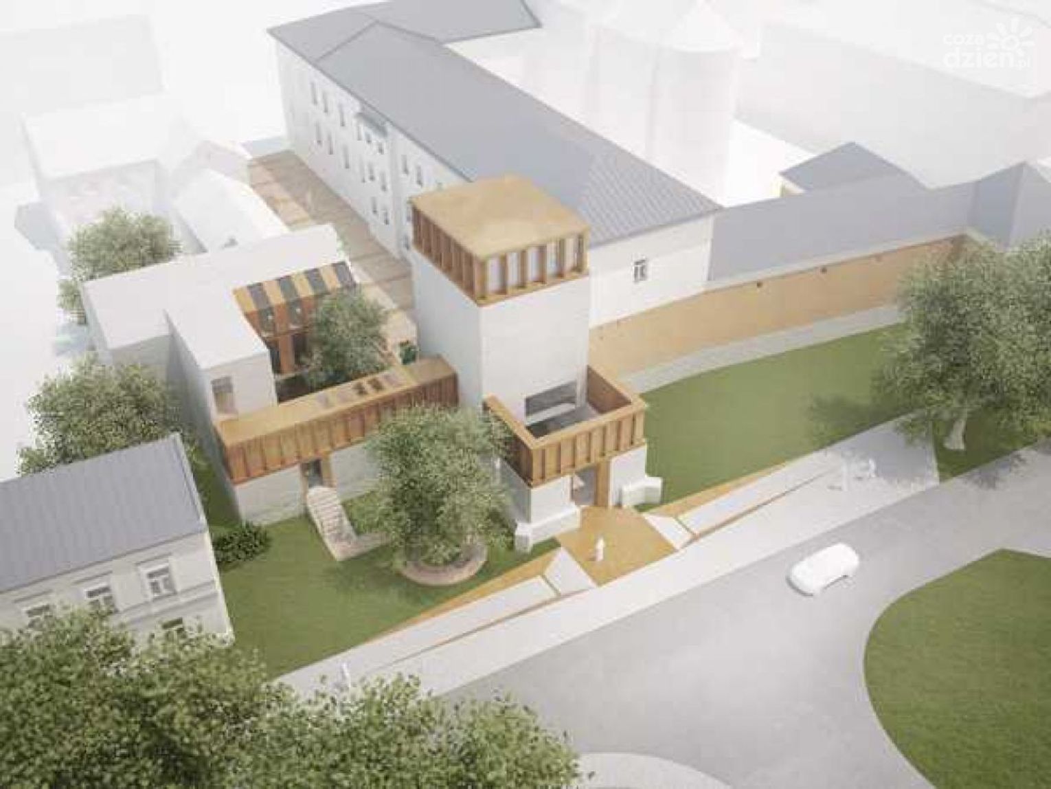 Istniejąca ścieżka „przymurna” została przekształcona w ciąg pieszy prowadzący w kierunku wejścia do części usługowej, zaś teren pomiędzy budynkiem i murem stał się kameralną przestrzenią publiczną. Rozwiązanie to pozwoli na zachowanie charakteru tego miejsca jako tętniącego życiem, muzyką i atmosferą relaksu zaułka miejskiego.
