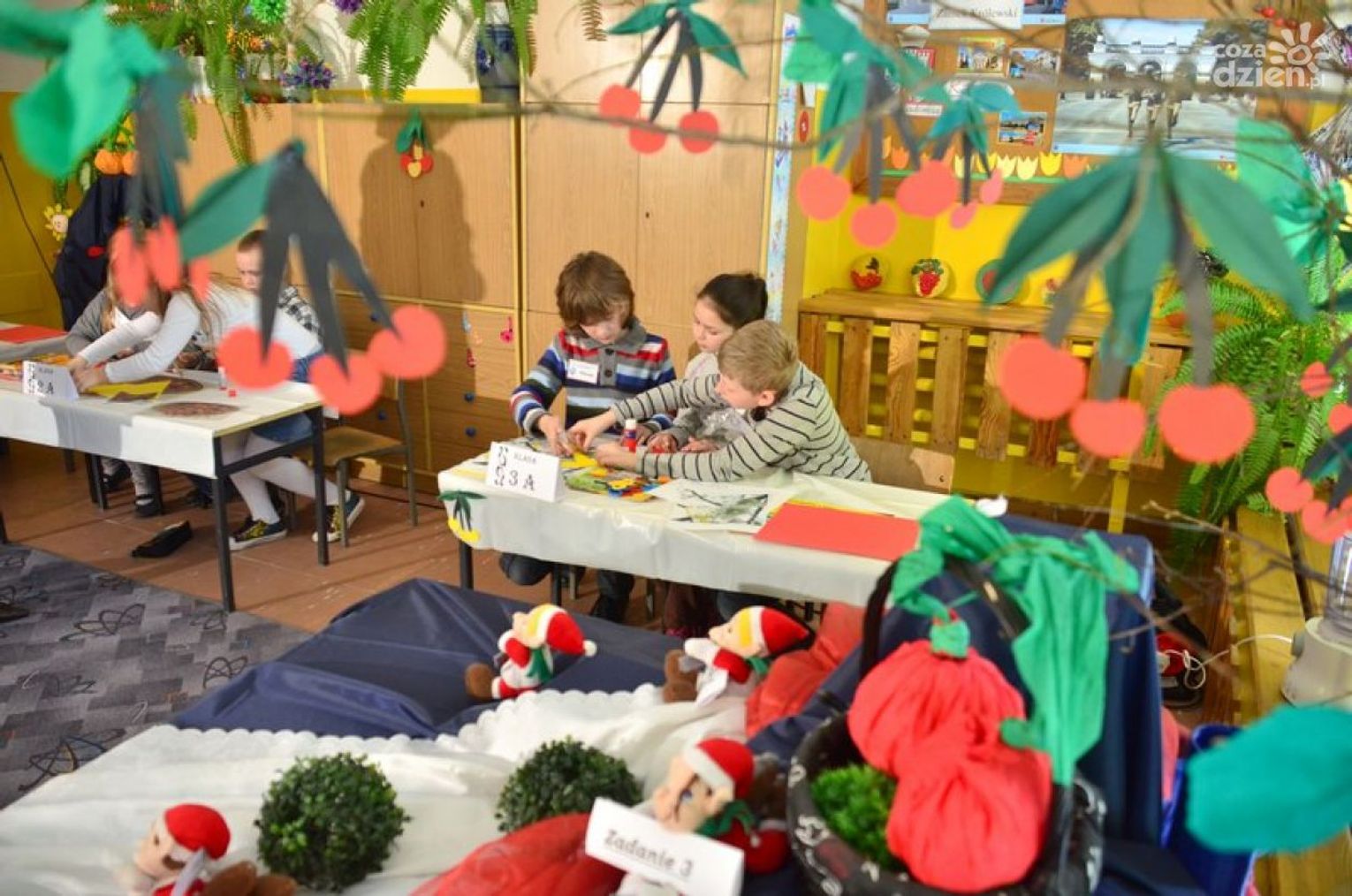Reprezentacje klas od 0 do 3 przywitała Owocowa Wróżka. Dzieci musiały wykonywać kolejne zadania przygotowane dla nich przez Czereśniowe Elfy: ułożyć czereśniowe puzzle, przyozdobić różnymi technikami obrazki przedstawiające czereśnie oraz odpowiedzieć na liczne pytania Owocowej Wróżki. Dowiedziały się również wielu ciekawostek na temat tego owocu oraz bogactwa witamin, który zawiera. Zapytaliśmy najmłodszych, czy lubią jeść owoce i warzywa: