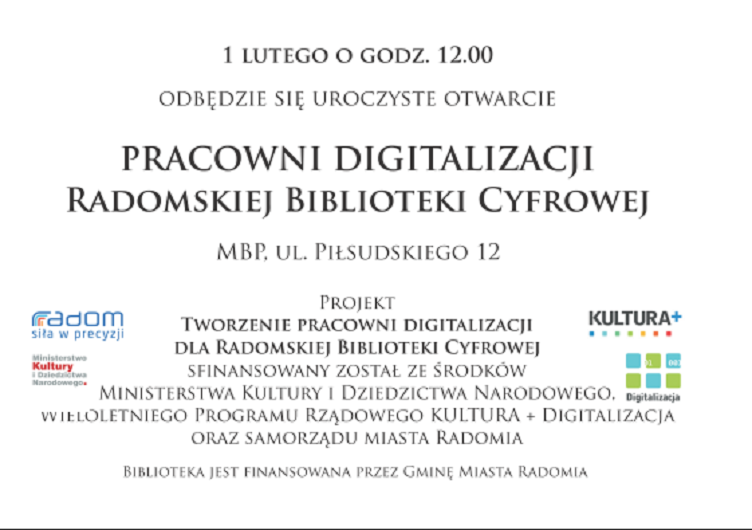 W zeszłym roku Miejska Biblioteka Publiczna zdobyła dofinansowanie na utworzenie Pracowni Dygitalizacji Radomskiej Biblioteki Cyfrowej. 1 lutego nastąpi jej uroczyste otwarcie.