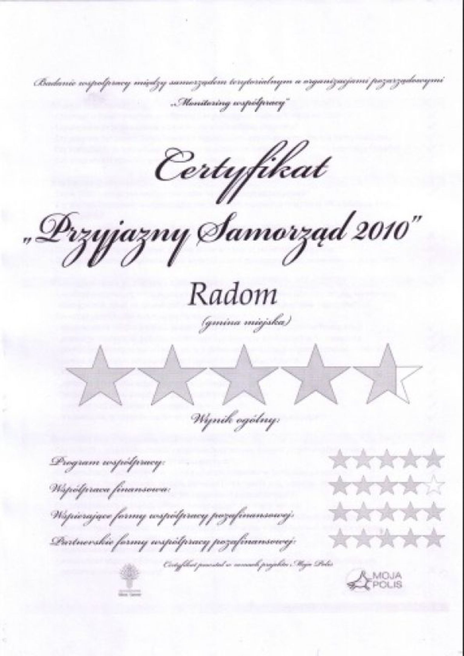 Radom uzyskał po 5 gwiazdek w dziedzinach funkcjonowania programu współpracy, partnerskich form współpracy poza finansowej i wspierania formy współpracy poza finansowej. Natomiast 4 gwiazdki dostał za współpracę finansową.