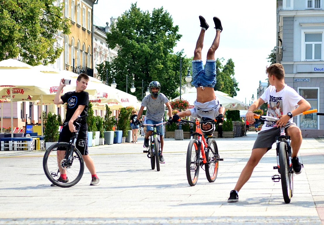 Wczoraj była świetna okazja, żeby zobaczyć ich w akcji na radomskim deptaku. Lakshay Jangid, Abishek Singh i Abhijeet Singh są mistrzami świata w swojej dyscyplinie. Z rowerem są w stanie zrobić wszystko. Jednym ich z popisowych tricków jest jazda na głowie.