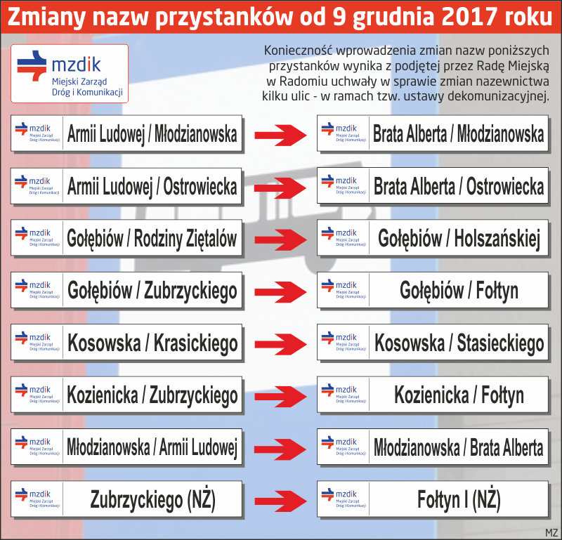 W związku z dekomunizacją i zmianą nazw niektórych ulic w Radomiu, od dnia 9 grudnia wybrane przystanki w Radomiu będą się nazywać inaczej (w tym dwie pętle końcowe na Gołębiowie).