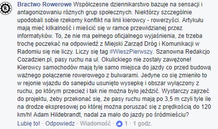 Bractwo Rowerowe uważa jednak, że konflikt pomiędzy kierowcami a rowerzystami, jest sztucznie rozdmuchiwany. Przynajmniej tak twierdzą przedstawiciele Bractwa, którzy skomentowali sprawę pod naszym postem na Facebooku.