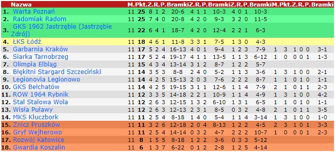 Po 11. kolejce liderem jest Warta Poznań, która do tej pory zgromadziła 25 punktów. Tyle samo „oczek” mają na swoim koncie piłkarze Radomiaka Radom. Skład podium uzupełnia GKS Jastrzębie, który traci do liderów trzy „oczka”. Na miejscu barażowym plasuje się ŁKS Łódź, jednak „Zieloni” mają już nad nimi siedem punktów przewagi. W strefie spadkowej znajdują się zespoły ze Znicza Pruszków, Gryfa Wejherowo, Rozwoju Katowice i Gwardii Koszalin.